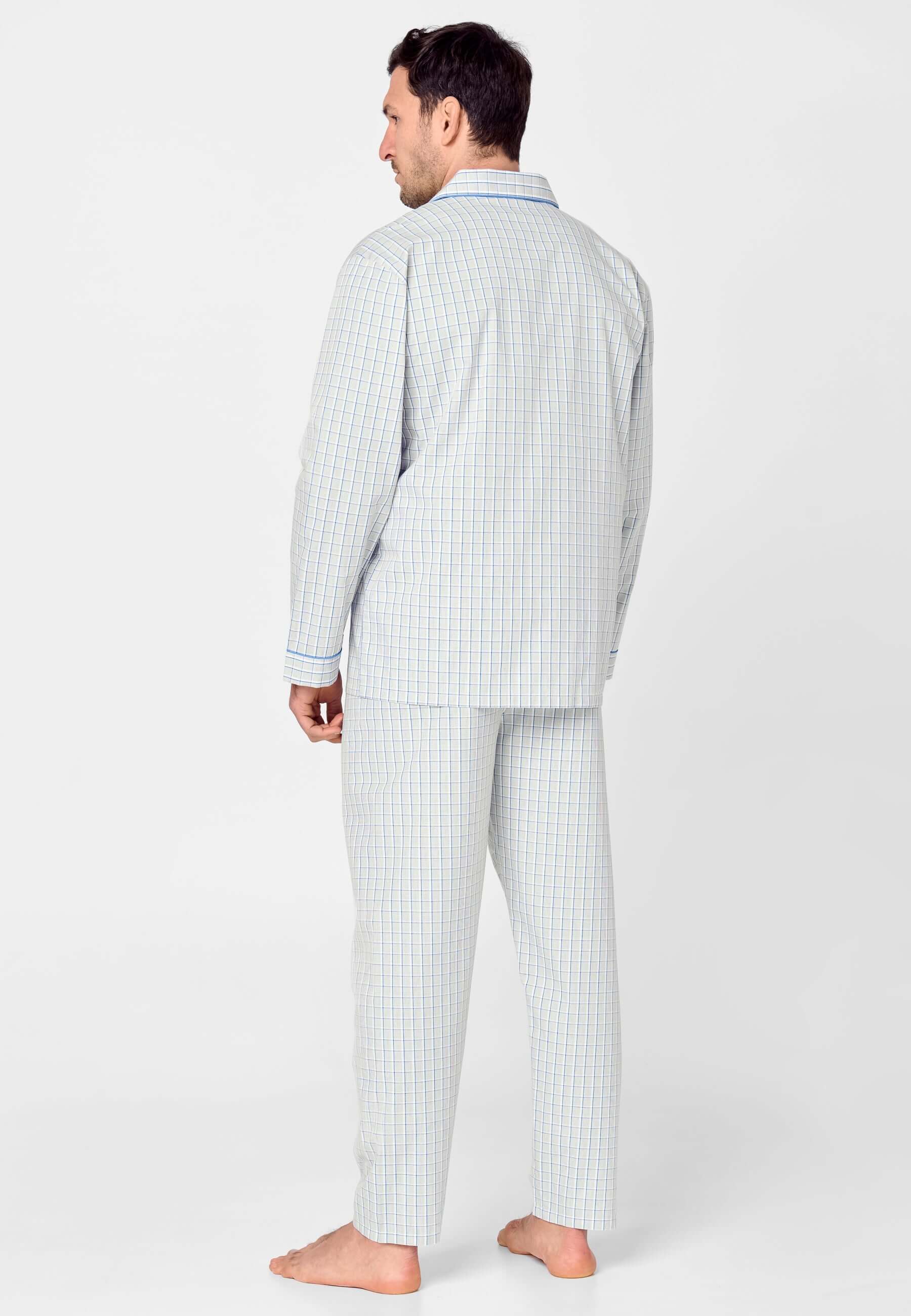 Set de pijama largo clásico de hombre de entretiempo a cuadros grises delimitados por cuadros azules y blancos. Edición "Essentials", confeccionado con tela popelín 100% algodón. Tejido que aporta suavidad y confort. Fit regular, con el mismo diámetro en las mangas y perneras, de tallaje holgado. Chaqueta con cuello solapa y cierre a botones personalizados con el nombre de la marca, con un bolsillo en el pecho y dos bolsillos a la altura de la cadera. Logo bordado en el pecho. Pantalón largo a juego de una sola costura sin bolsillos con bragueta a dos botones verticales cubierta por tela, que permite desabrocharla por completo. Cintura elástica con cinta hecha de la misma tela que permite un mayor ajuste del pantalón.