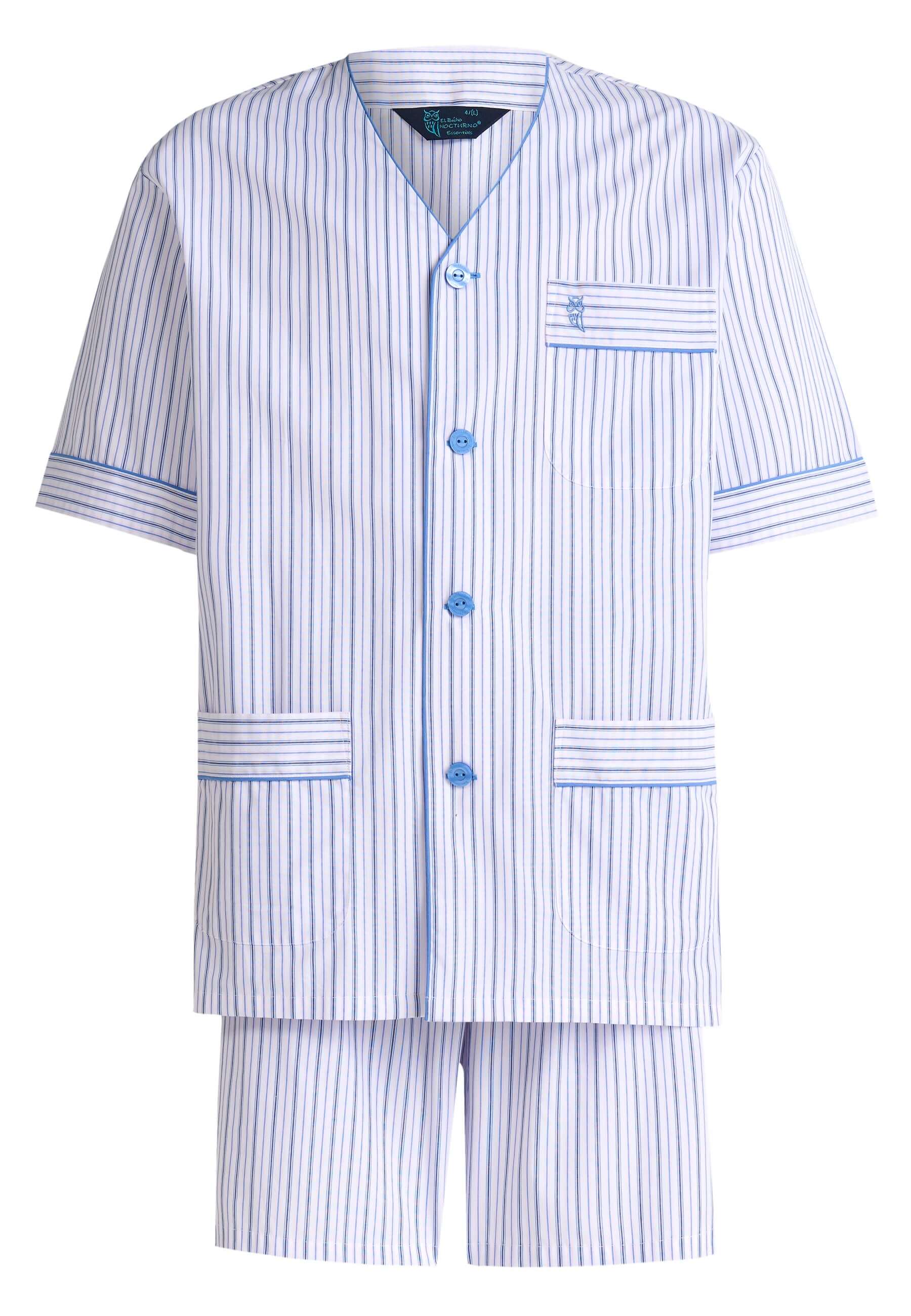 Set de pijama corto clásico de hombre de entretiempo a rayas rosas, blancas y azules. Edición "Essentials", confeccionado con tela popelín 100% algodón. Tejido que aporta suavidad y confort. Fit regular, con el mismo diámetro en las mangas y perneras, de tallaje holgado. Chaqueta de manga corta con cuello judo y botones personalizados con el nombre de la marca, con un bolsillo en el pecho y dos bolsillos a la altura de la cadera. Logo bordado en el pecho. Pantalón corto a juego de una sola costura sin bolsillos con bragueta a dos botones verticales cubierta por tela, que permite desabrocharla por completo. Cintura elástica con cinta hecha de la misma tela que permite un mayor ajuste del pantalón.