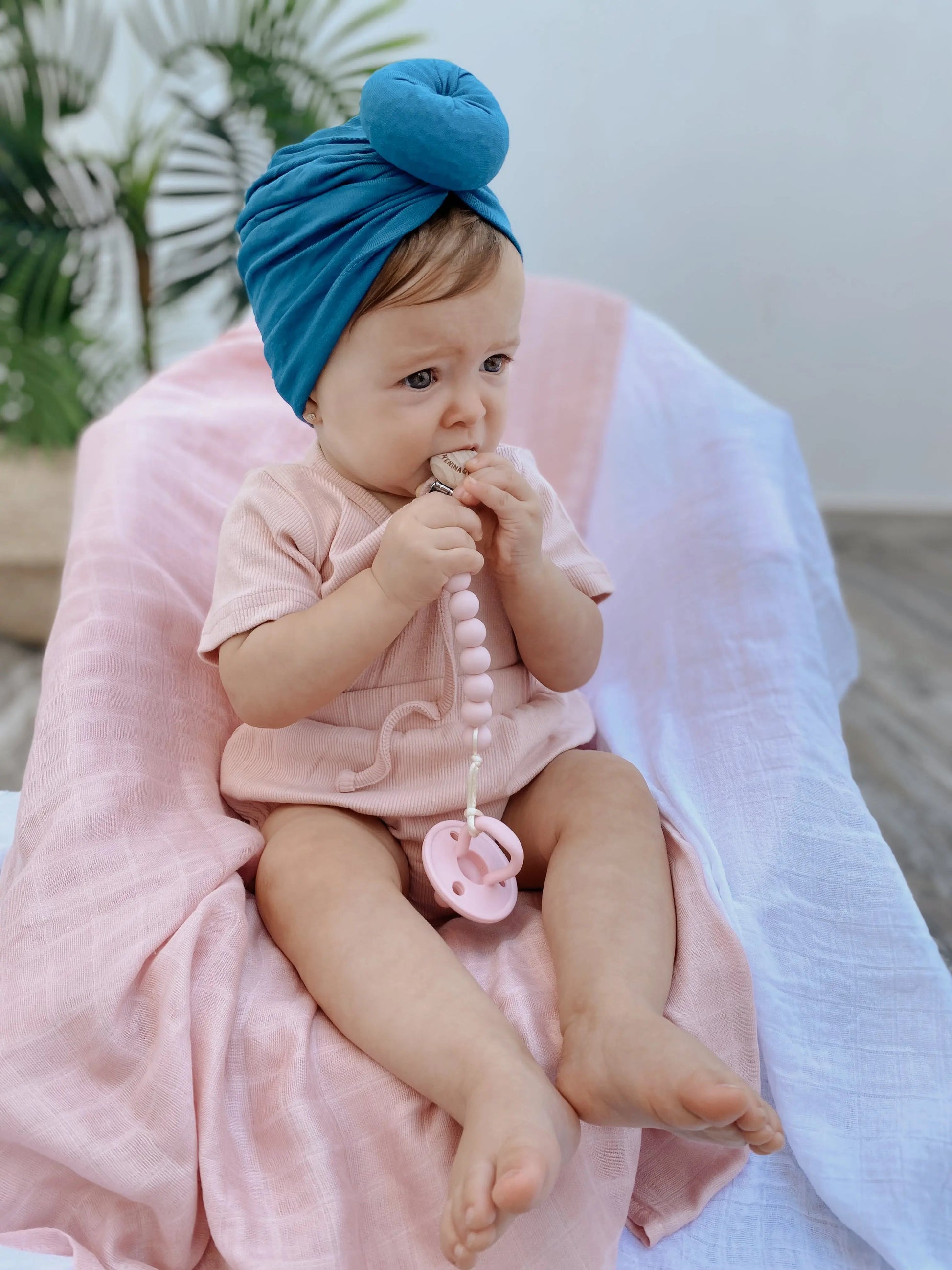 Conjunto primera puesta Rosa + Turbante blanco + Chupetero Spring Rosa chicle y Chupete Rosa chicle