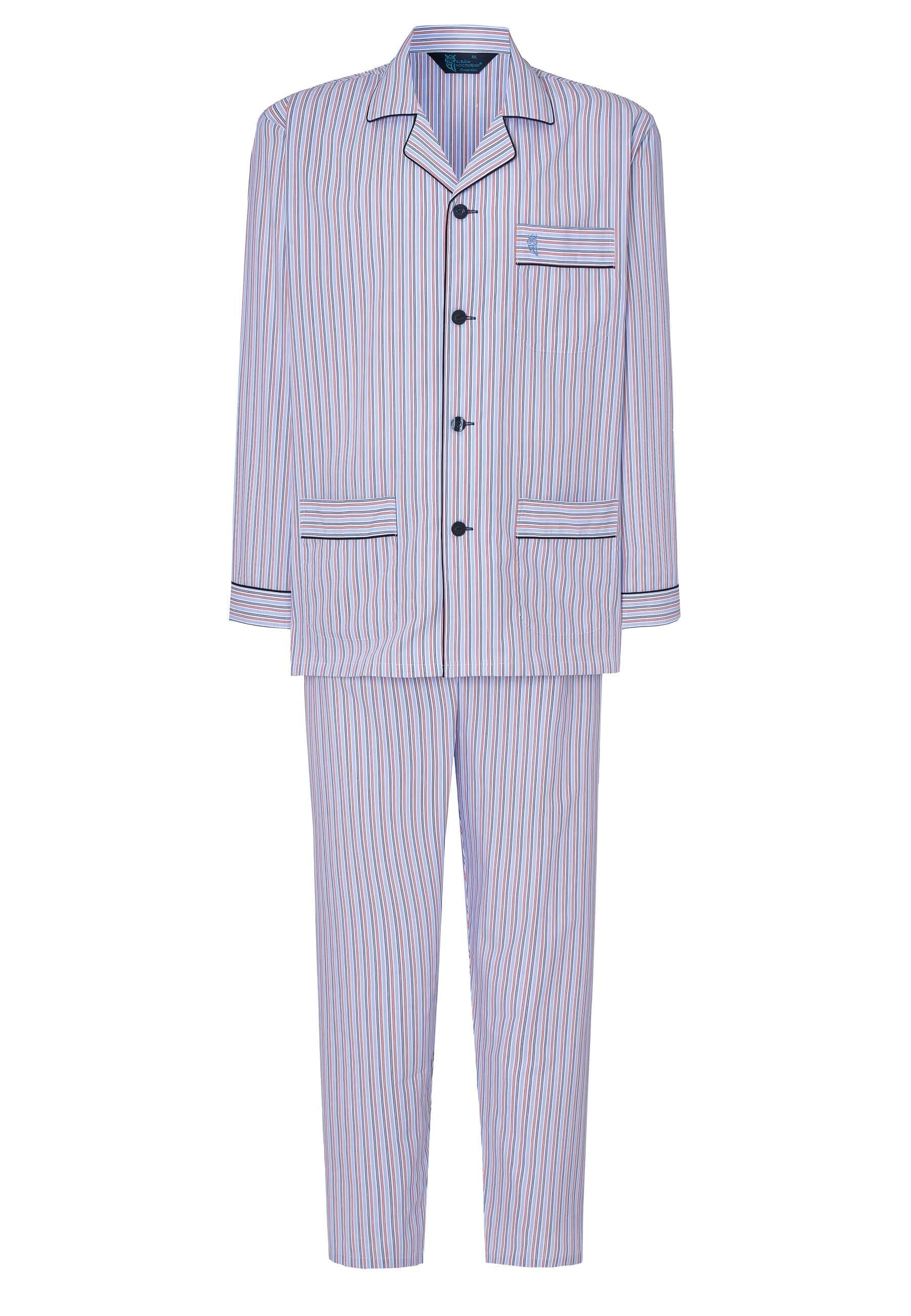 Set de pijama largo clásico de hombre de entretiempo a rayas blancas con celestes, rojas , azules y marino. Edición "Essentials", confeccionado con tela popelín 100% algodón. Tejido que aporta suavidad y confort. Fit regular, con el mismo diámetro en las mangas y perneras, de tallaje holgado. Chaqueta con cuello solapa y cierre a botones personalizados con el nombre de la marca, con un bolsillo en el pecho y dos bolsillos a la altura de la cadera. Logo bordado en el pecho. Pantalón largo a juego de una sola costura sin bolsillos con bragueta a dos botones verticales cubierta por tela, que permite desabrocharla por completo. Cintura elástica con cinta hecha de la misma tela que permite un mayor ajuste del pantalón.