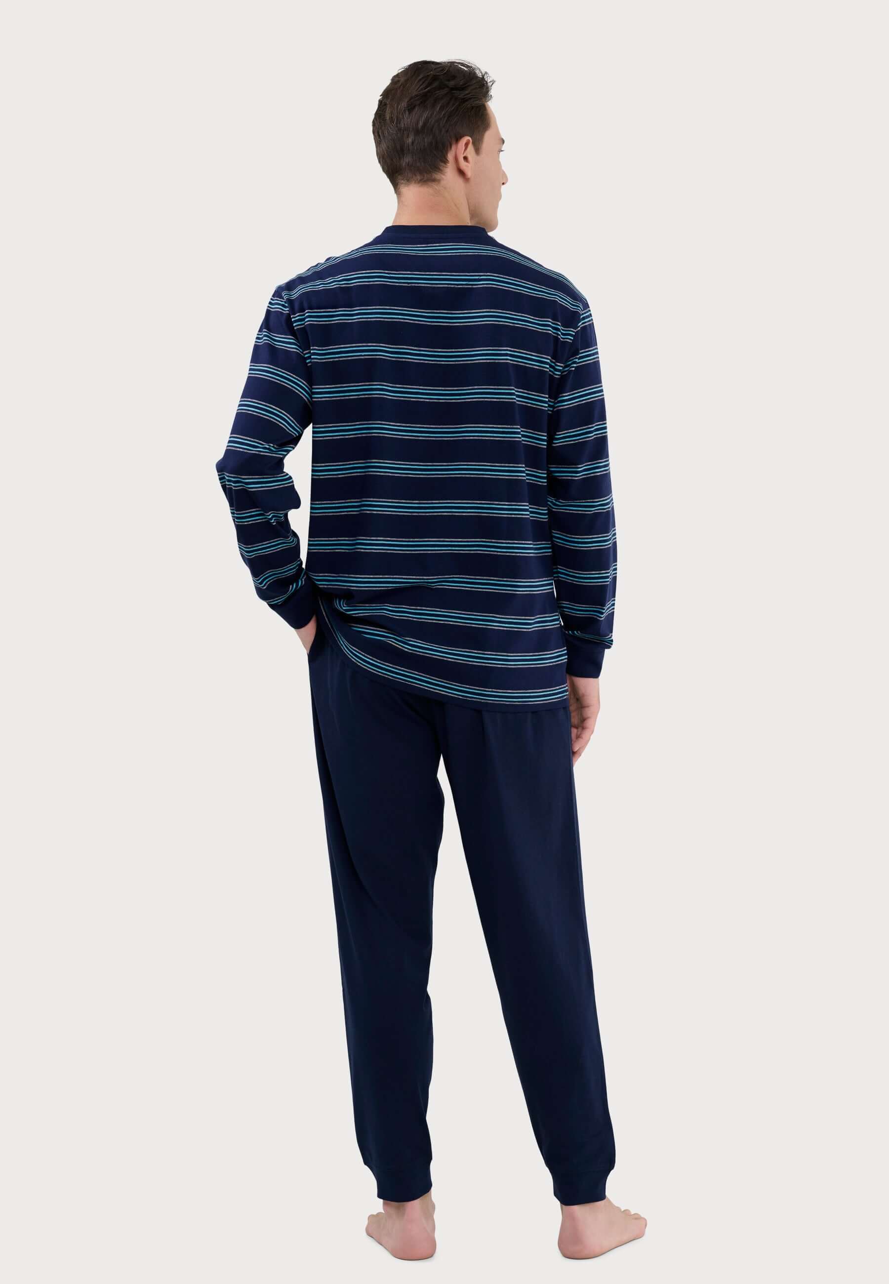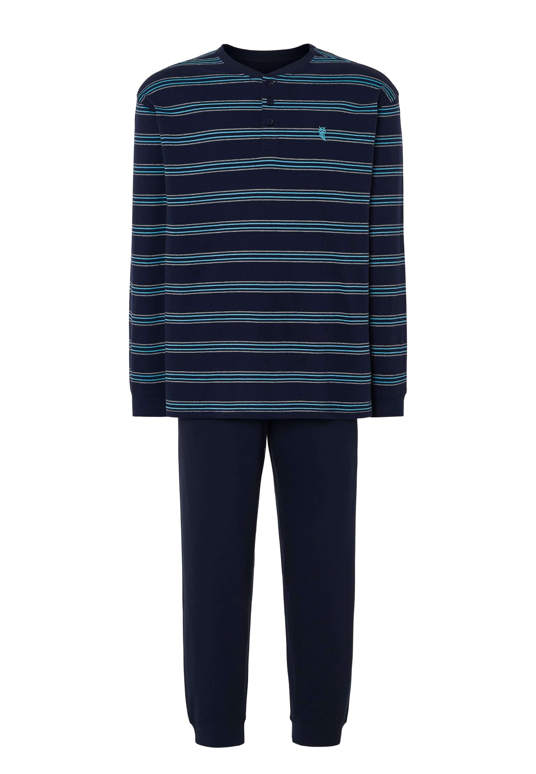 Set de pijama largo moderno de hombre de entretiempo con parte de arriba a rayas azul marino y turquesa. Edición "Essentials", confeccionado en punto de 160gr/sqm 100% algodón, que otorgan gran suavidad, color brillante y resistencia a la rotura. Fit regular, con el mismo diámetro en las mangas y perneras, de tallaje holgado. Un pijama confortable, elegante pero desenfadado. Parte de arriba de manga larga con cuello en tapeta a tres botones. Logo bordado en el pecho. Pantalón largo liso marino con dos bolsillos laterales a la altura de la cintura y sin bragueta.
