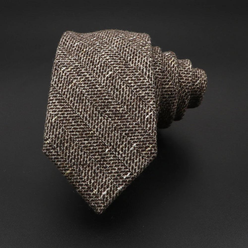 Estas corbatas están hechas a mano con lana auténtica, lo que les da un tacto de textura profunda. Su ancho fino de 6,5 cm le da un aspecto moderno y elegante. Este diseño tiene un patrón de espiga marrón. La corbata tiene un sutil hilo dorado tejido que brilla con la luz.
