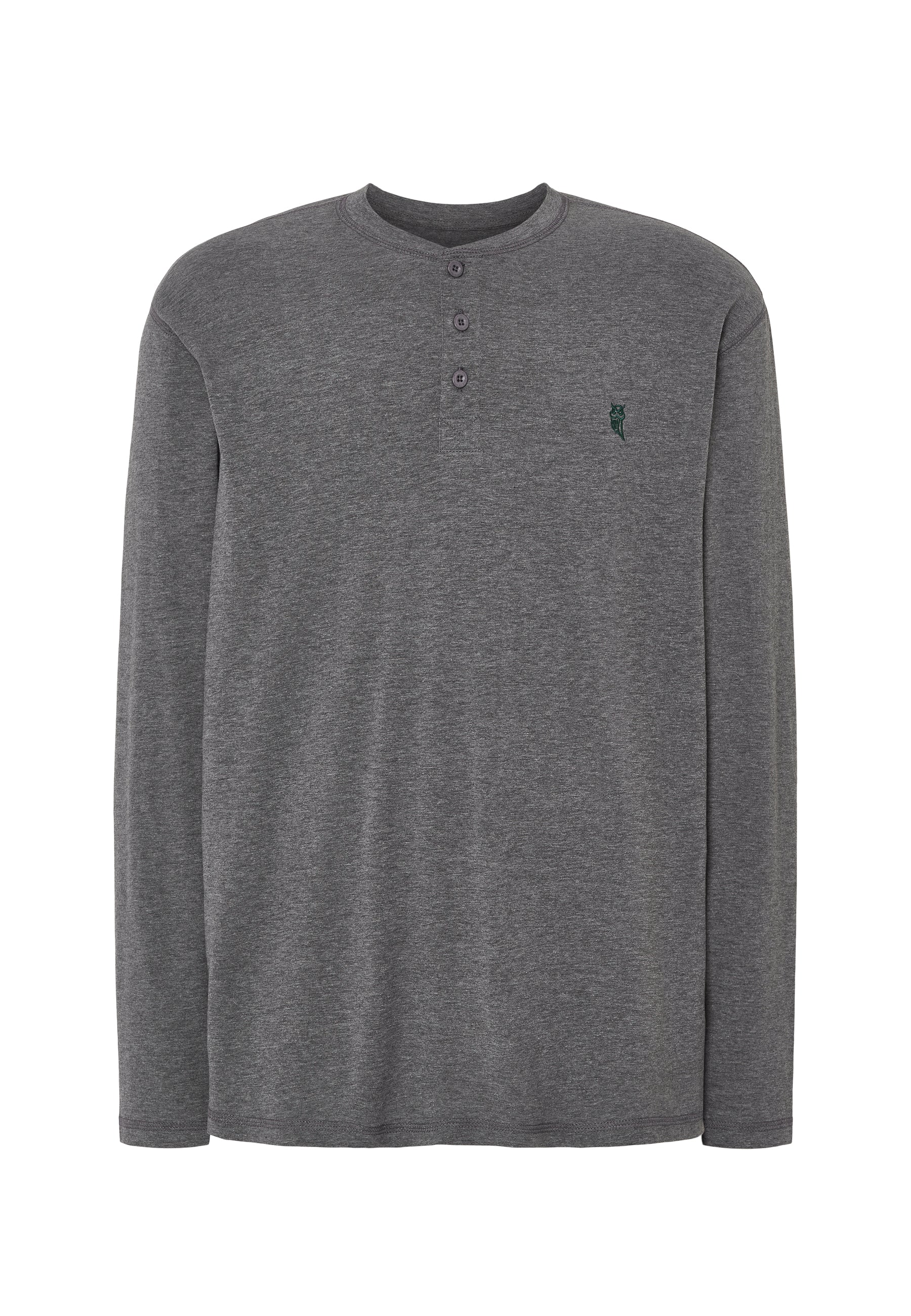 Camiseta básica lisa de manga larga de punto, 75% algodón 25% viscosa. Edición "Essentials". Color Gris oscuro con cuello tapeta a tres botones personalizados. Logo bordado en el pecho. Camiseta multiuso cómoda tanto para interior como exterior. Fresca, agradable al tacto y absorbente.