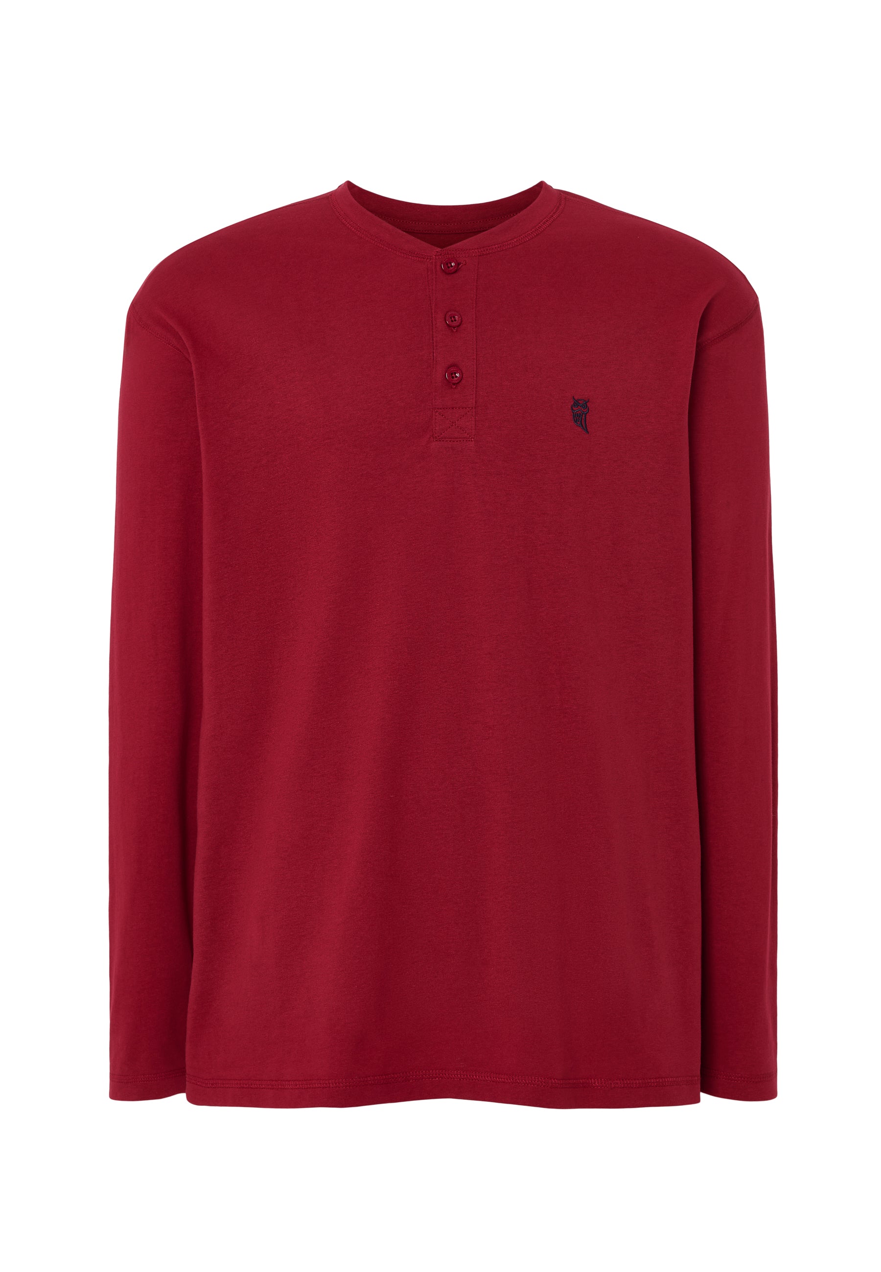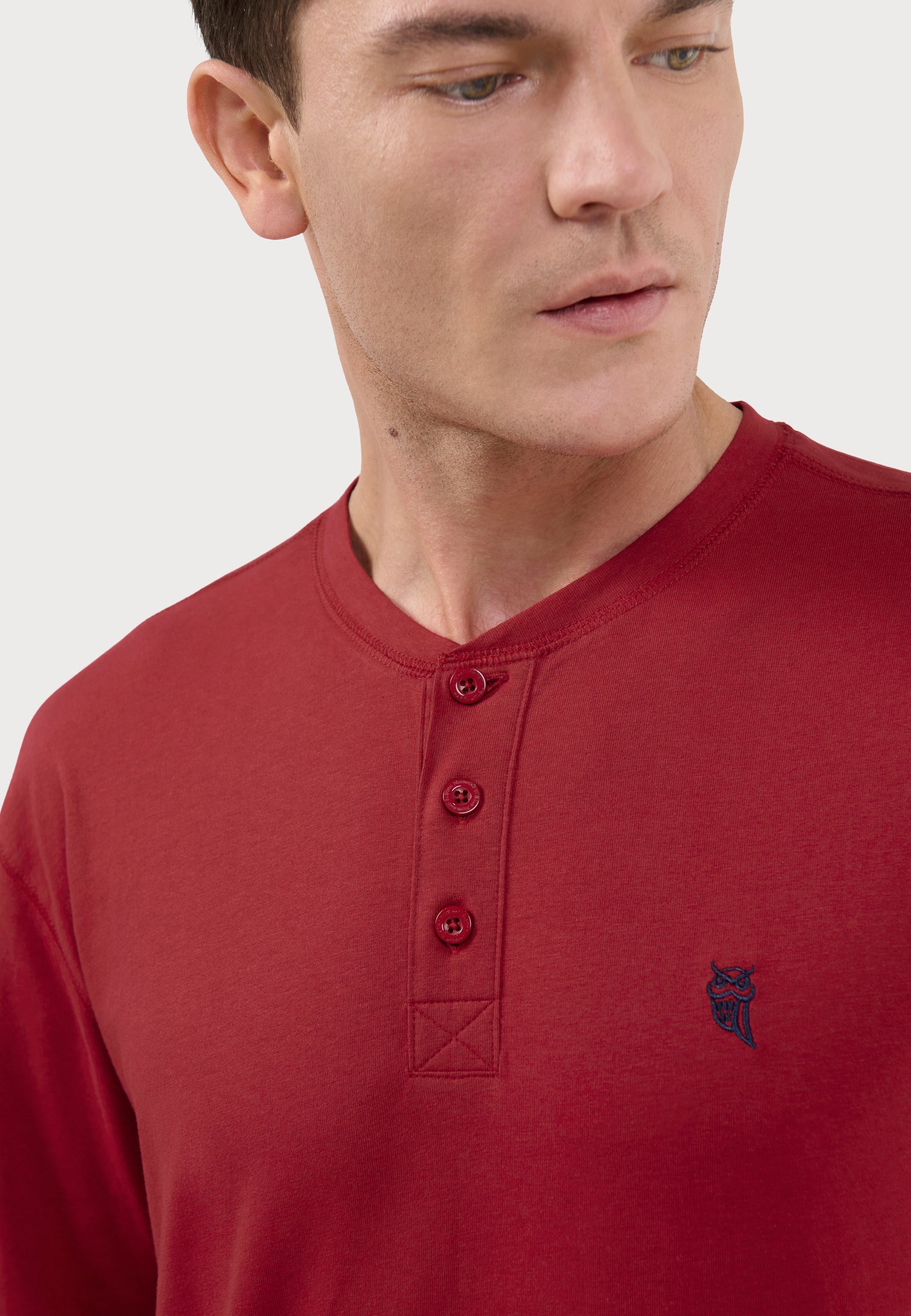 Camiseta básica lisa de manga larga de punto, 100% algodón. Edición "Essentials". Color burdeos con cuello tapeta a tres botones personalizados. Logo bordado en el pecho. Camiseta multiuso cómoda tanto para interior como exterior. Fresca, agradable al tacto y absorbente.