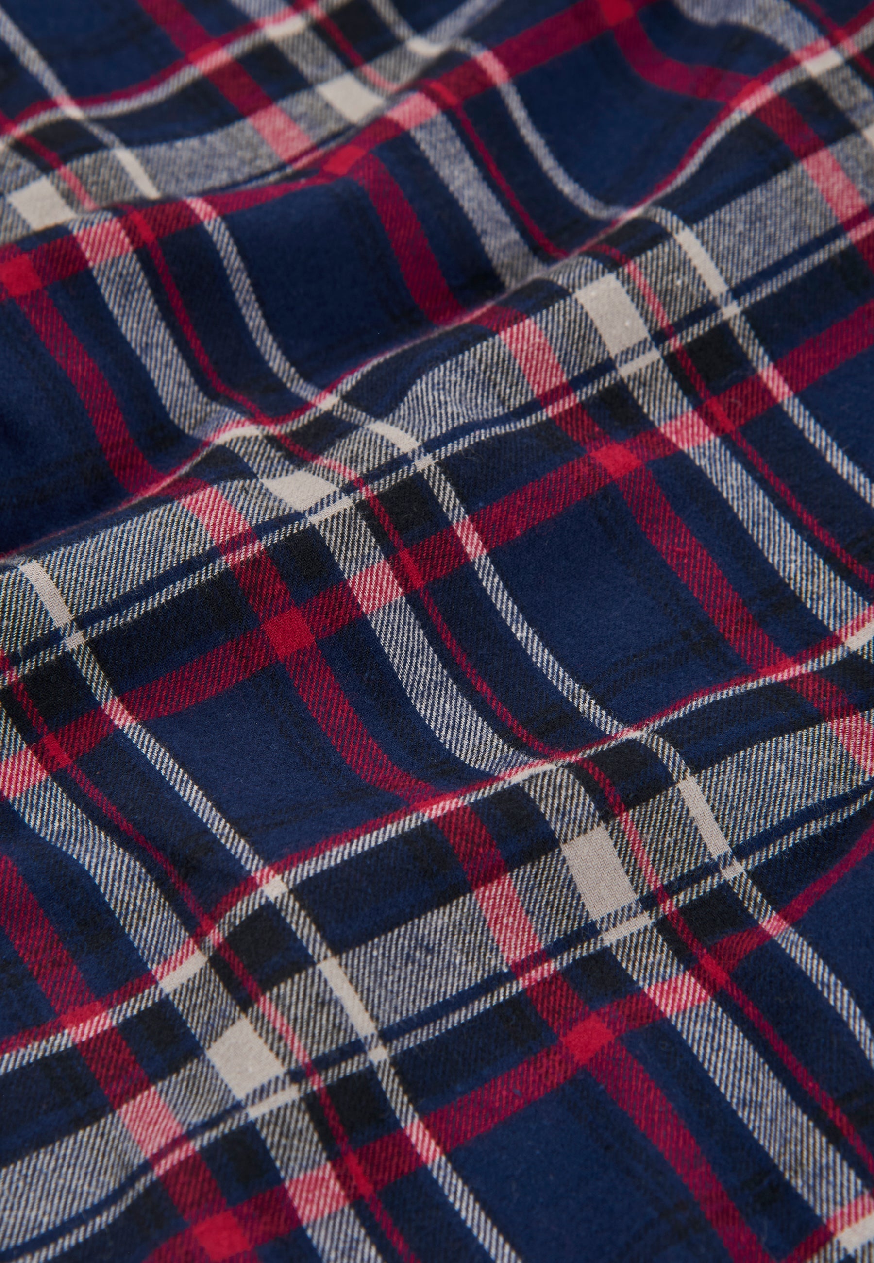Pantalón largo de pijama premium de hombre a cuadros rojos y blancos sobre azul marino. Edición "The Gentlemen's Choice", confeccionado en franela 100% algodón de gruesos cabos doble peinado y peso 170g/m2. De gran suavidad, definición de color y resistencia. Fit regular con perneras holgadas. Pantalón agradable al tacto, muy confortable. Logo bordado en la parte superior izquierda del mismo. Diseñado con dos costuras y dos bolsillos laterales. Con bragueta a dos botones verticales cubierta por tela, que permite desabrocharlo por completo. Cintura elástica con cinta personalizada que puede proporcionar un mayor ajuste del pantalón.