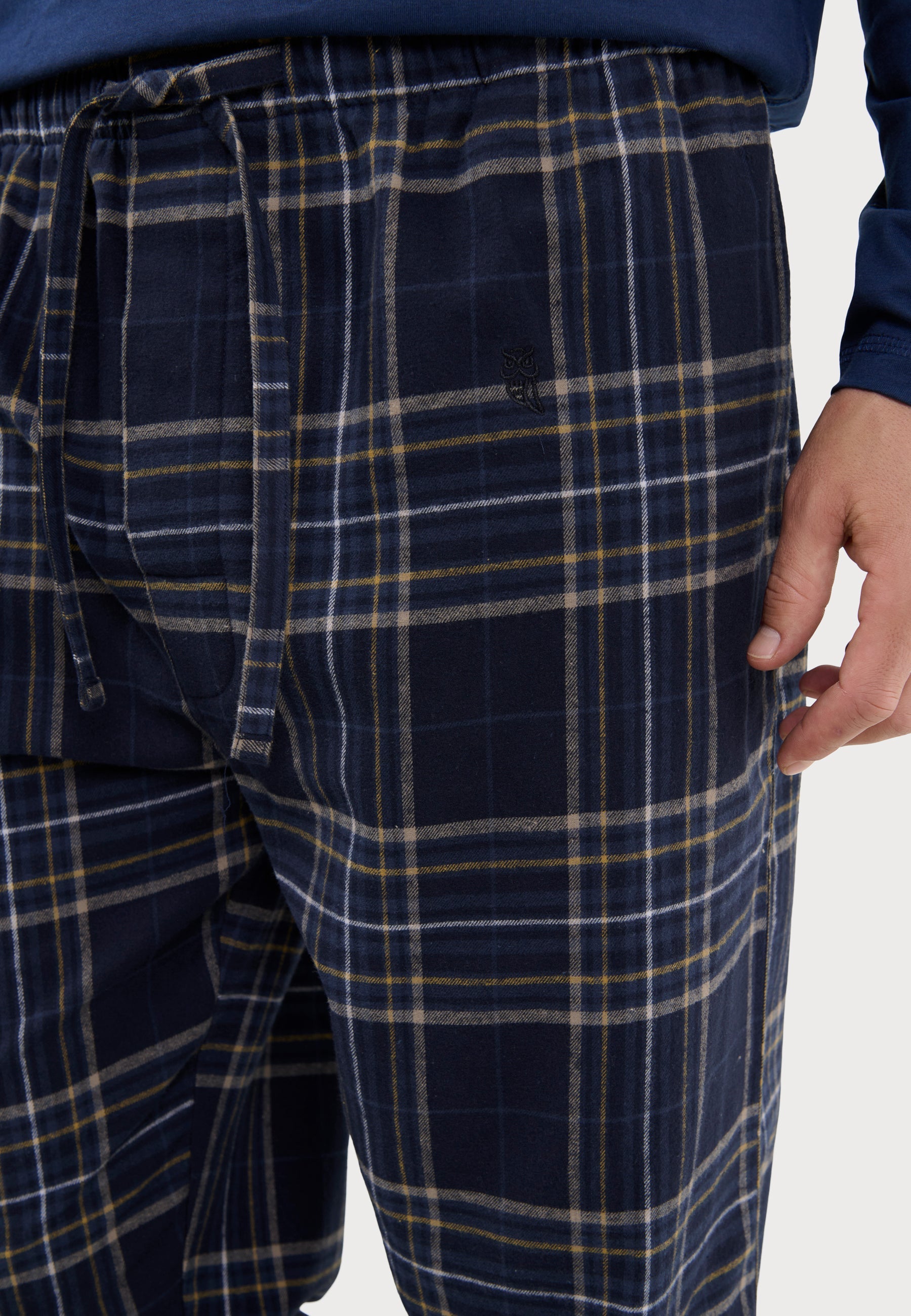 Pantalón largo de pijama premium de hombre a cuadros en varias tonalidades de azul. Edición "The Gentlemen's Choice", confeccionado en franela 100% algodón de gruesos cabos doble peinado y peso 170g/m2. De gran suavidad, definición de color y resistencia. Fit regular con perneras holgadas. Pantalón agradable al tacto, muy confortable. Logo bordado en la parte superior izquierda del mismo. Diseñado con dos costuras y dos bolsillos laterales. Con bragueta a dos botones verticales cubierta por tela, que permite desabrocharlo por completo. Cintura elástica con cinta personalizada que puede proporcionar un mayor ajuste del pantalón.