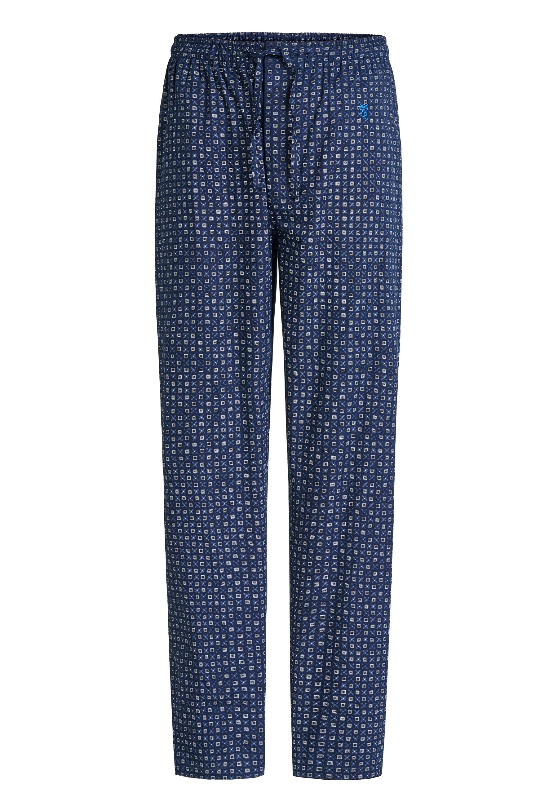 Pantalón largo de pijama de hombre con estampado geométrico blanco sobre marino. Edición "Essentials", confeccionados en tela popelín 100% algodón an cabos 50x50, tejido suave, con gran definición del color y resistencia. Fit regular, con perneras holgadas. Pantalón agradable al tacto, muy confortable. Logo bordado en color azul. Diseñado con dos costuras con dos bolsillos laterales y bragueta a dos botones verticales cubierta por tela, que permite desabrocharlo por completo. Cintura elástica con cinta personalizada que permite un mayor ajuste del pantalón.