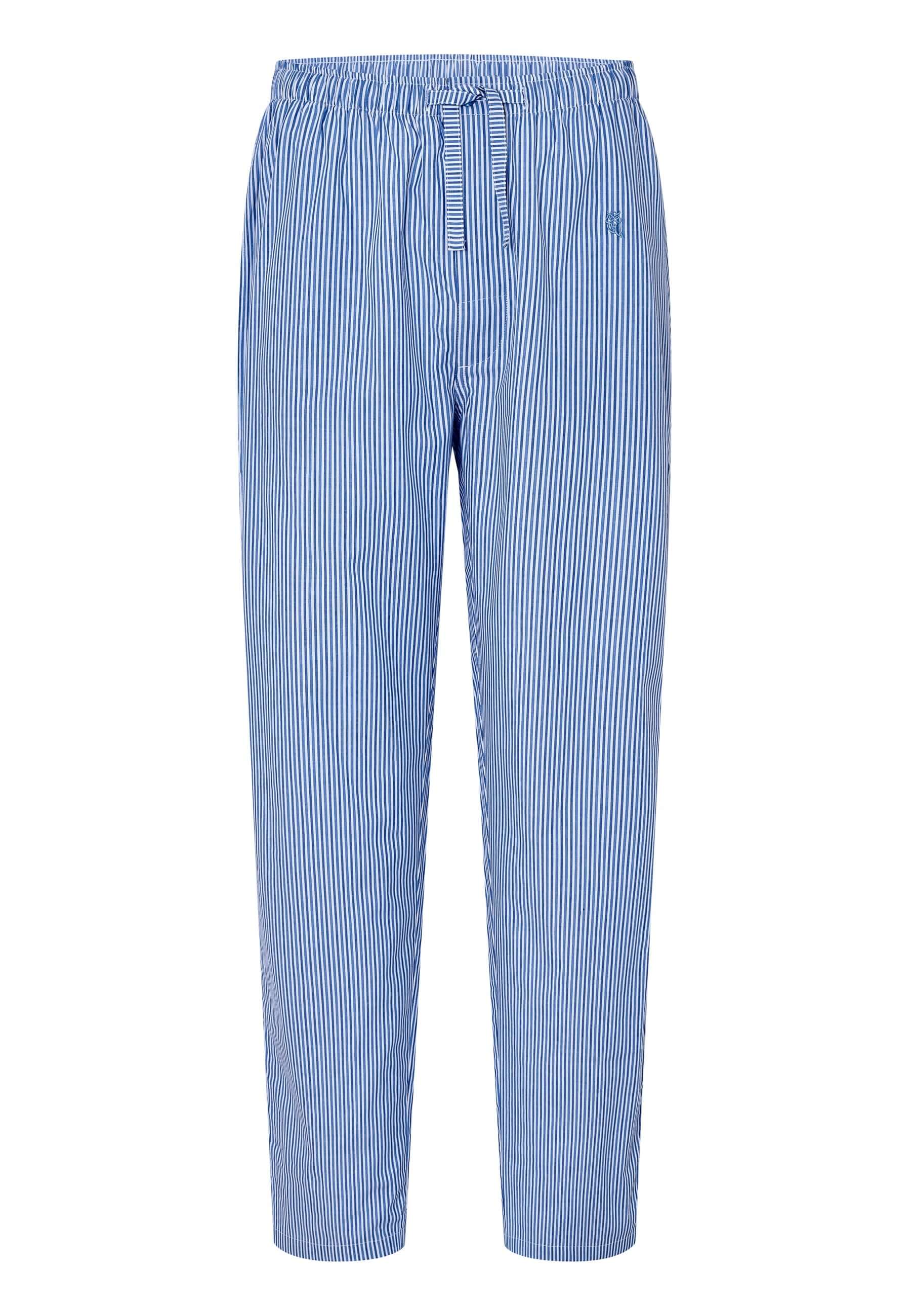 Pantalón de pijama largo de hombre a rayas azules. Edición "Essentials", confeccionados en tela popelín 100% algodón. Tejido suave, con gran definición del color y resistencia. Fit regular, con perneras holgadas. Pantalón agradable al tacto, muy confortable. Logo bordado en color marino. Diseñado con dos costuras con dos bolsillos laterales y bragueta a dos botones verticales cubierta por tela, que permite desabrocharlo por completo. Cintura elástica con cinta personalizada que permite un mayor ajuste del pantalón.