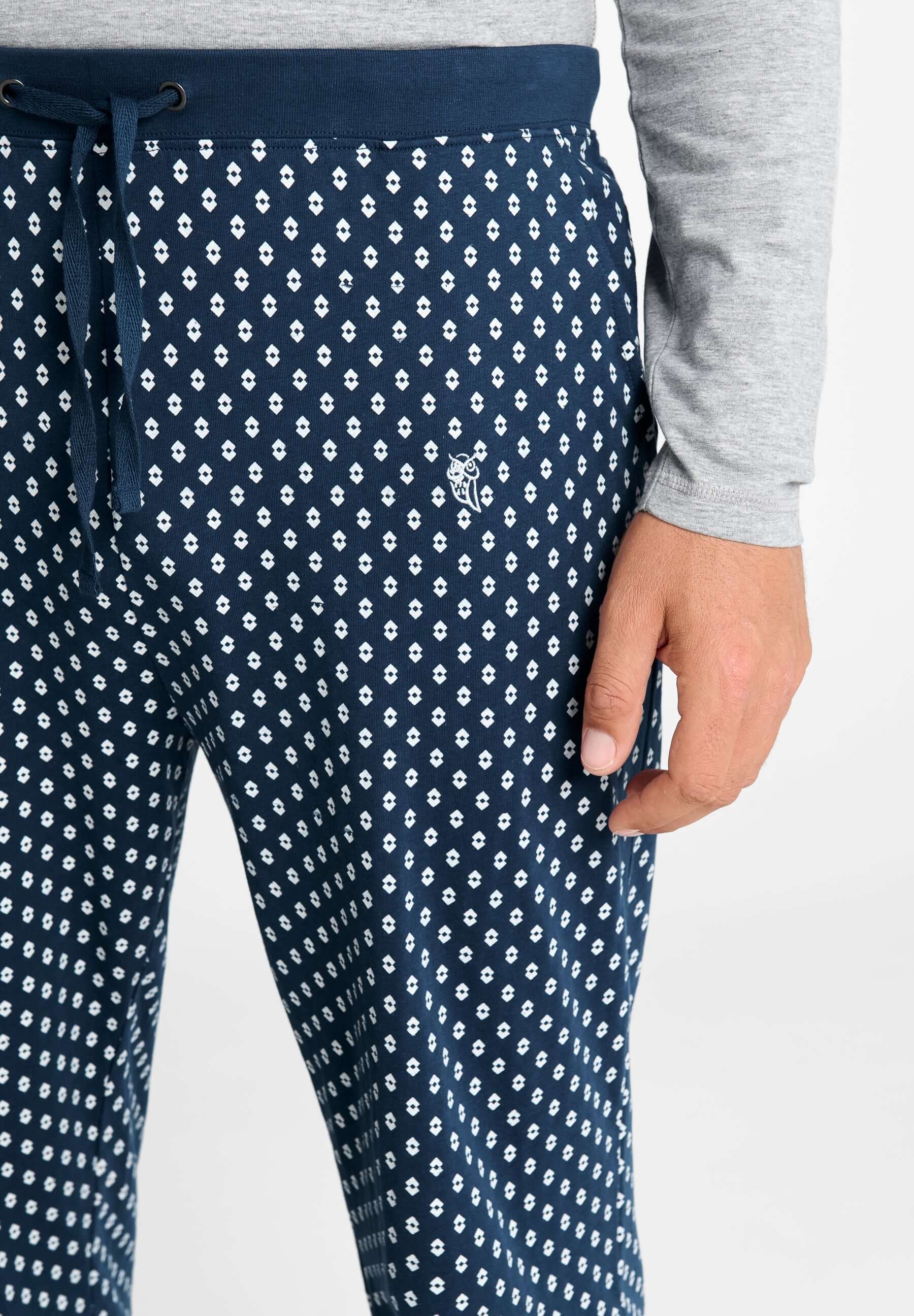 Pantalón de pijama largo de hombre de punto en estampado de rombos blancos sobre azul. Pantalón agradable al tacto, muy confortable. Edición "Essentials", confeccionados en Punto 100% algodón, otorgan suavidad, gran definición del color y resistencia. Fit regular con perneras holgadas. Pantalón agradable al tacto, muy confortable. Logo bordado en la pernera en color gris. Cintura elástica con cinta a juego que permite un mayor ajuste del pantalón.
