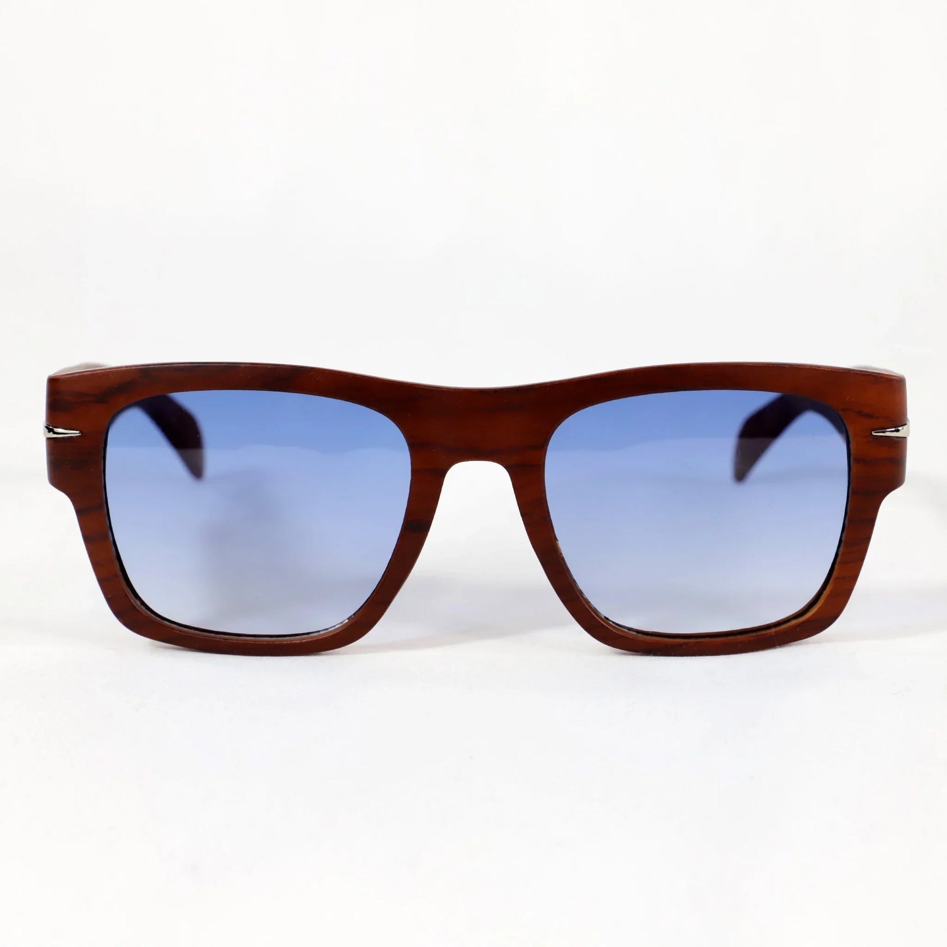 Pechón · gafas de sol cuadradas con vetas de madera y lentes azules