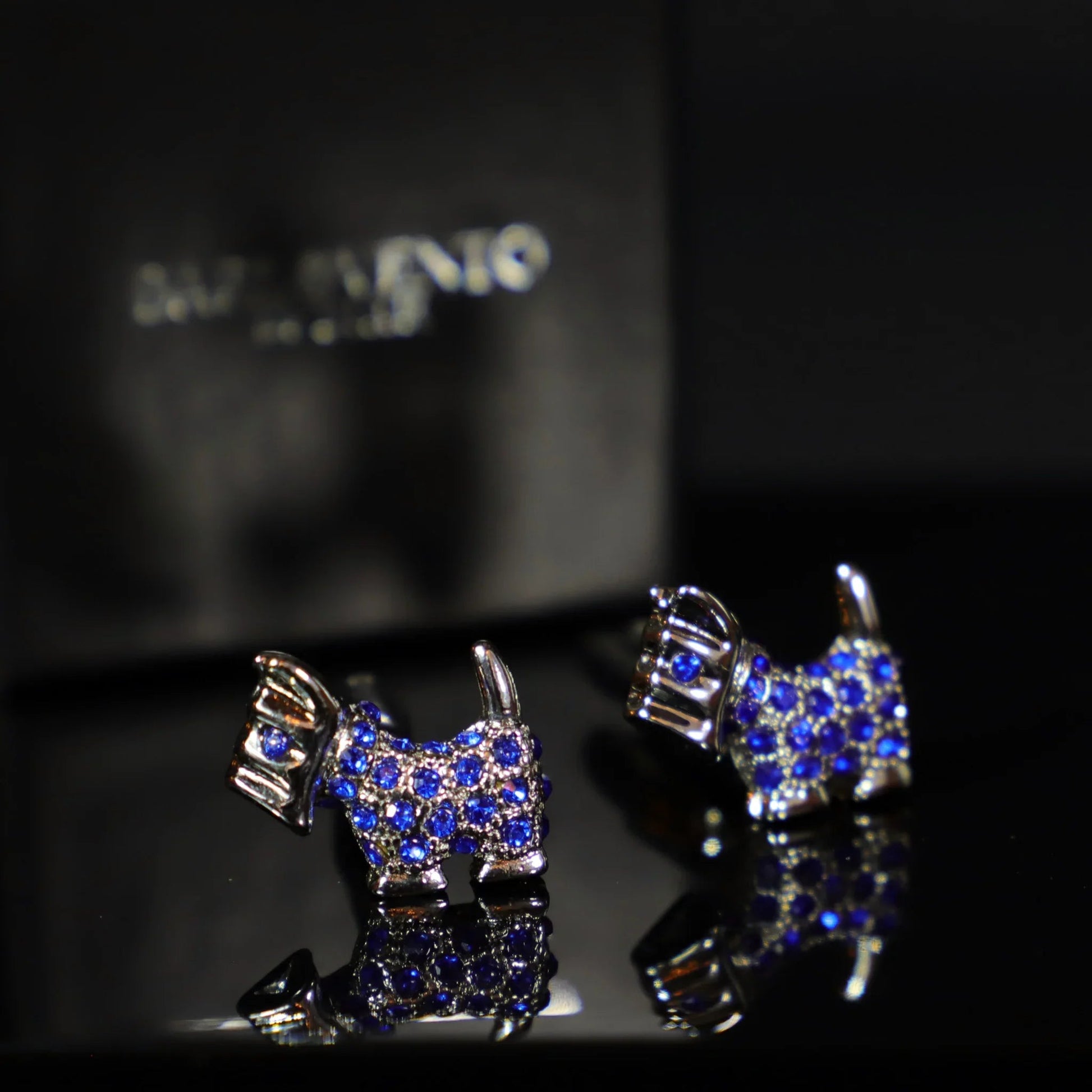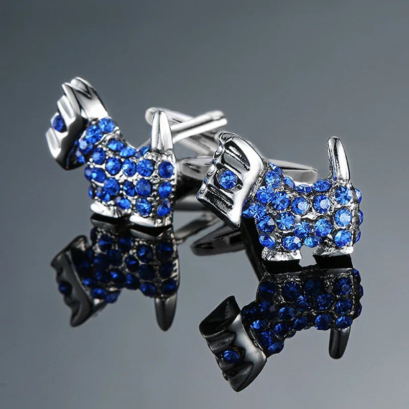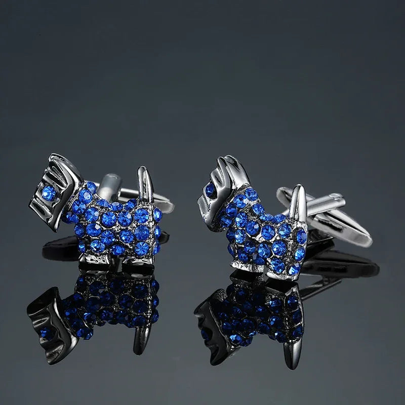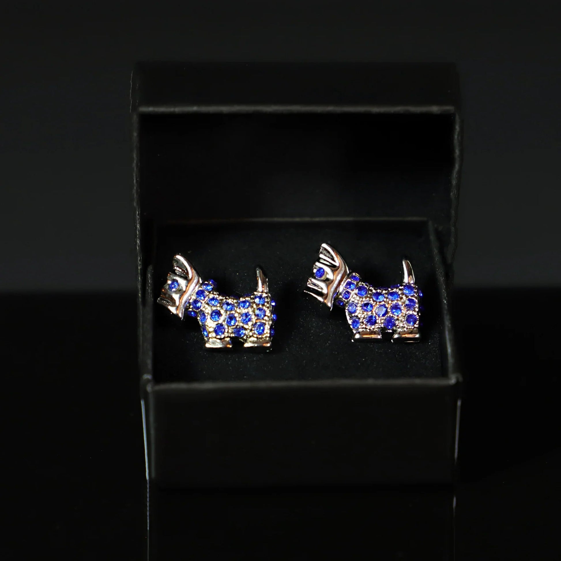 Estos hermosos gemelos tienen la forma de terriers escoceses. Tienen una base de metal brillante con gemas azules que brillan con la luz. Incluye caja de regalo.