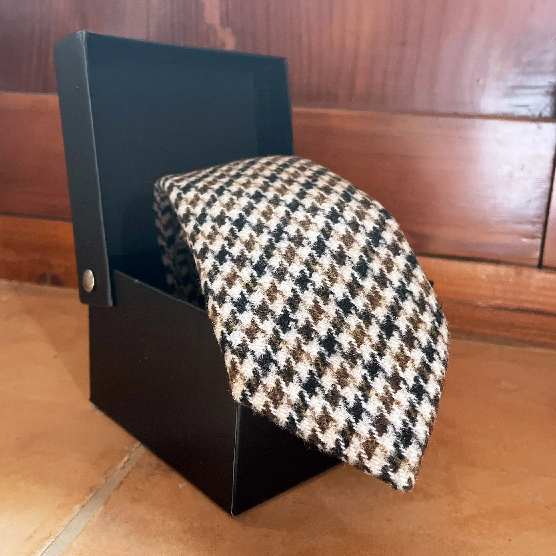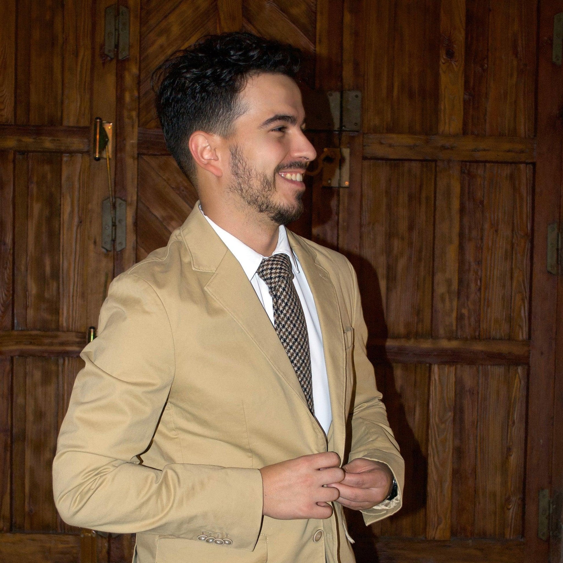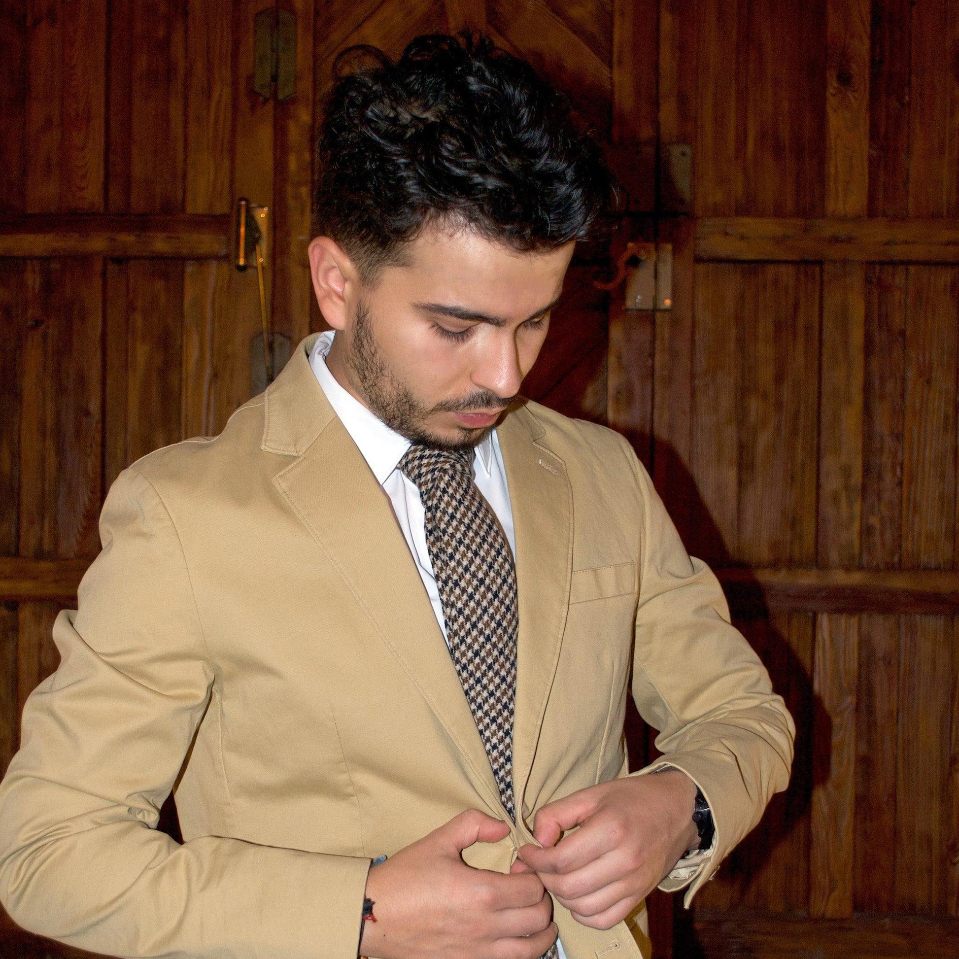 Estas corbatas están hechas a mano con lana auténtica, lo que les da un tacto de textura profunda. Su fino ancho de 6,5 cm le da un aspecto moderno y elegante. Este diseño presenta diferentes tonos de marrón en un elegante patrón de pata de gallo.