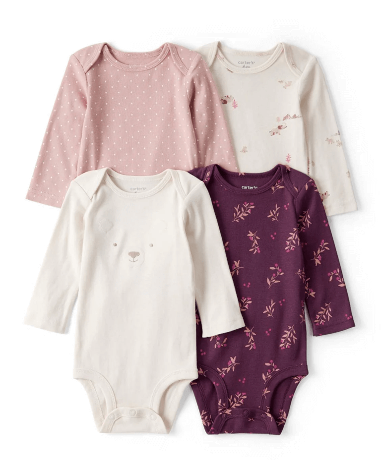 Pack de cuatro bodies de manga larga para bebé niña con diseños de osos en tonos malva y neutros. Confeccionados en algodón suave para ofrecer comodidad durante todo el día. Incluyen cierres a presión en la entrepierna para facilitar el cambio de pañal.