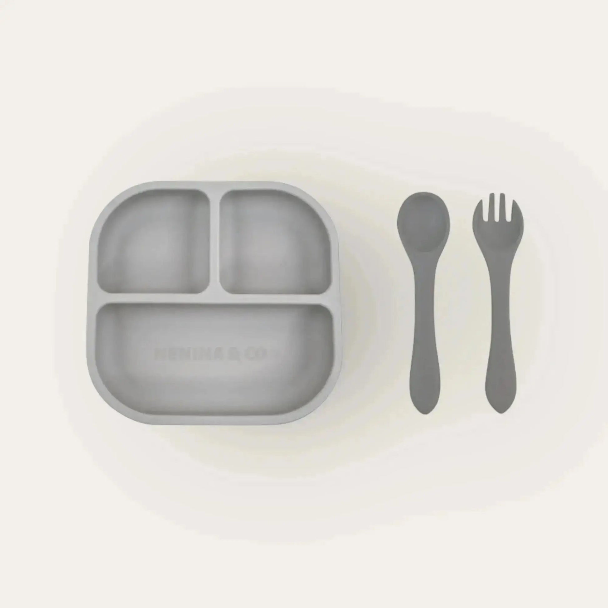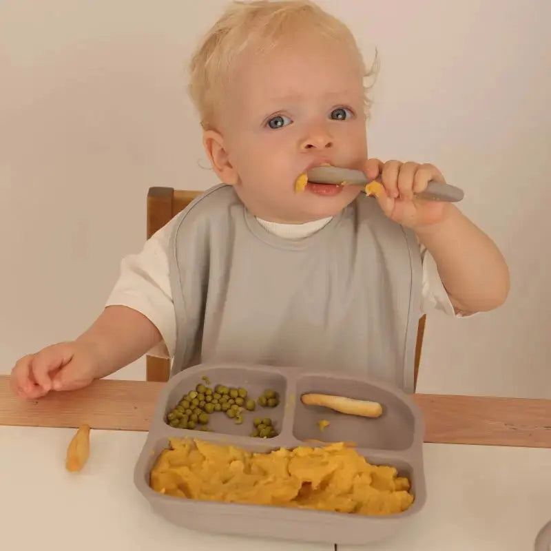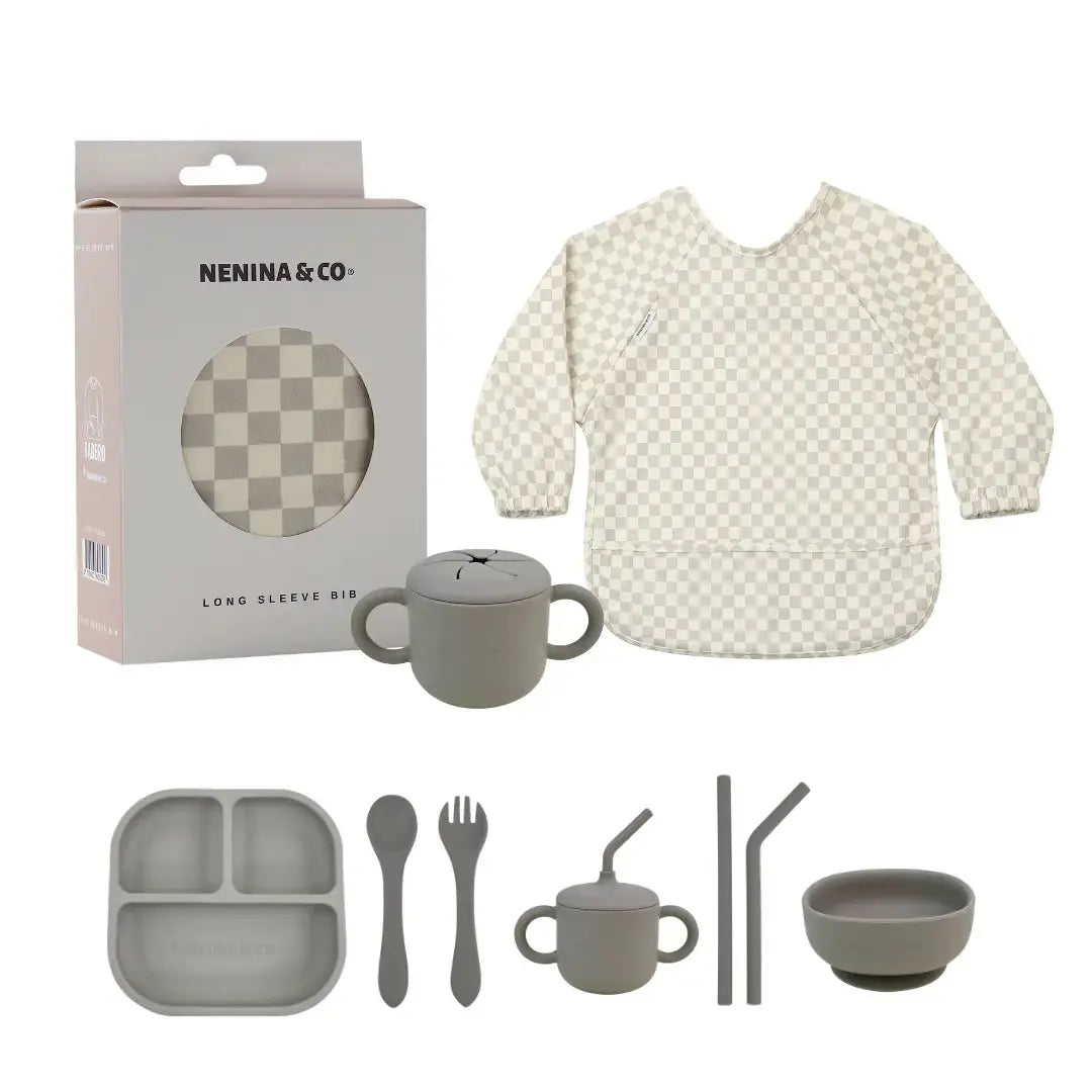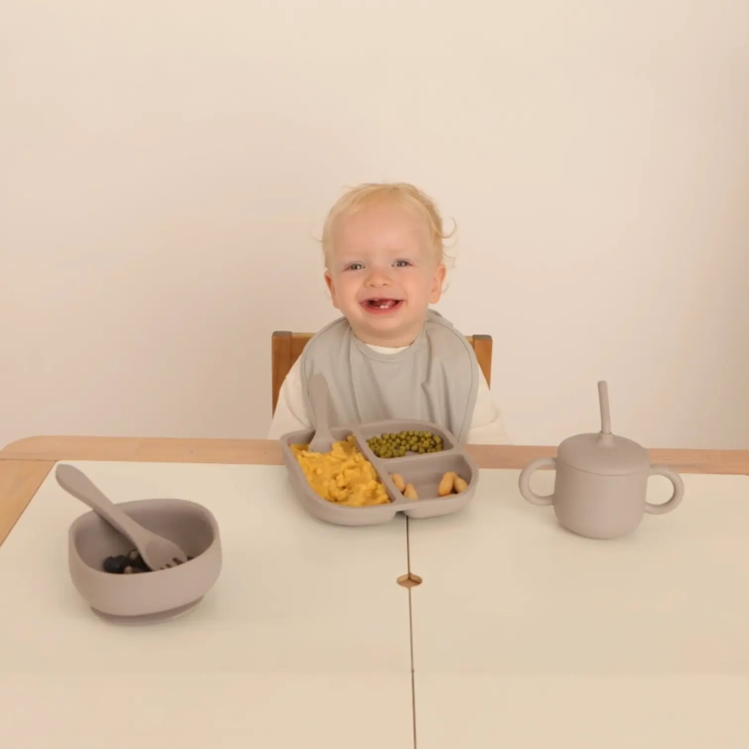 Kit Deluxe Vajilla + Babero BLW Gris 9 Piezas de Silicona orgánica con ventosas Nenina & Co
