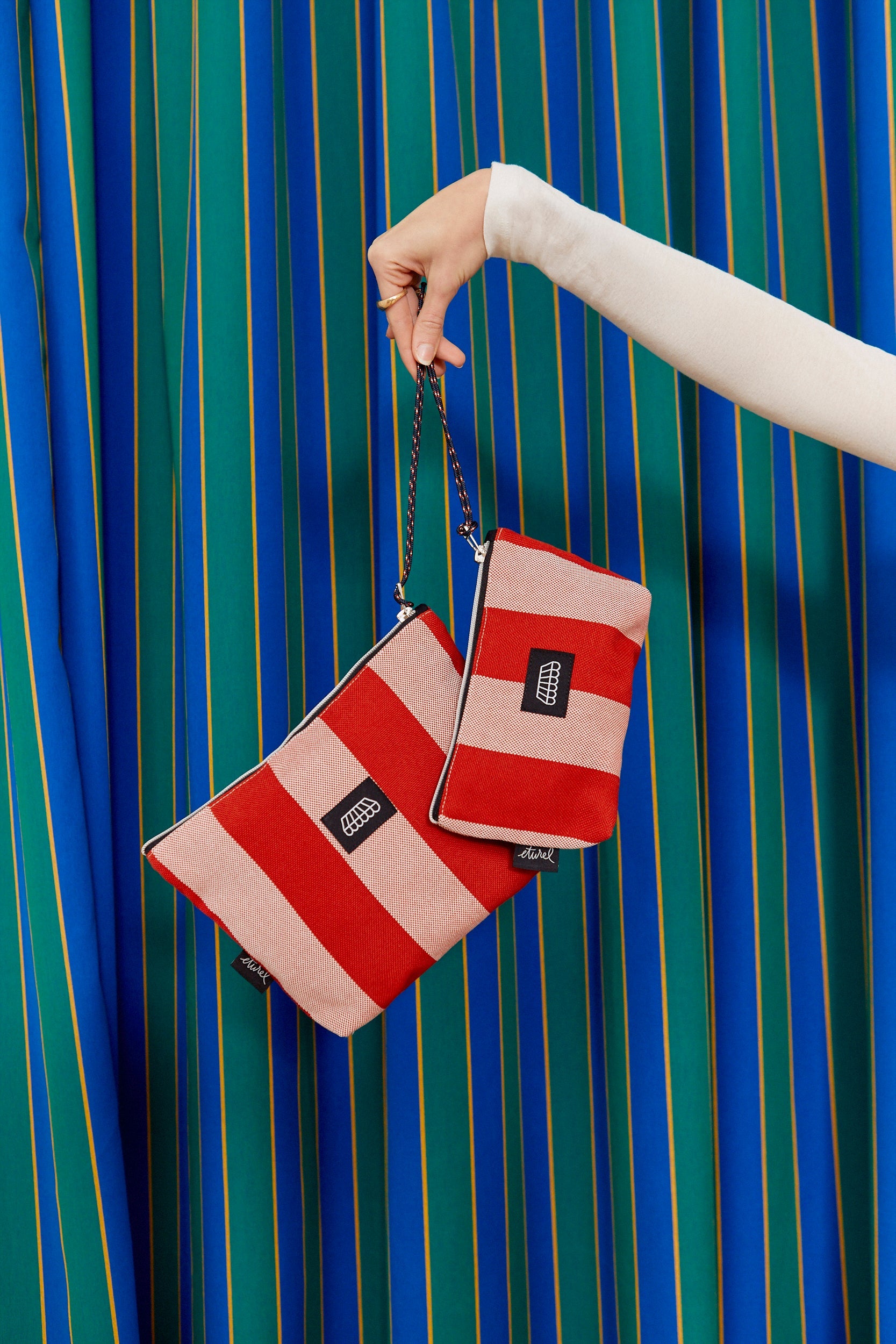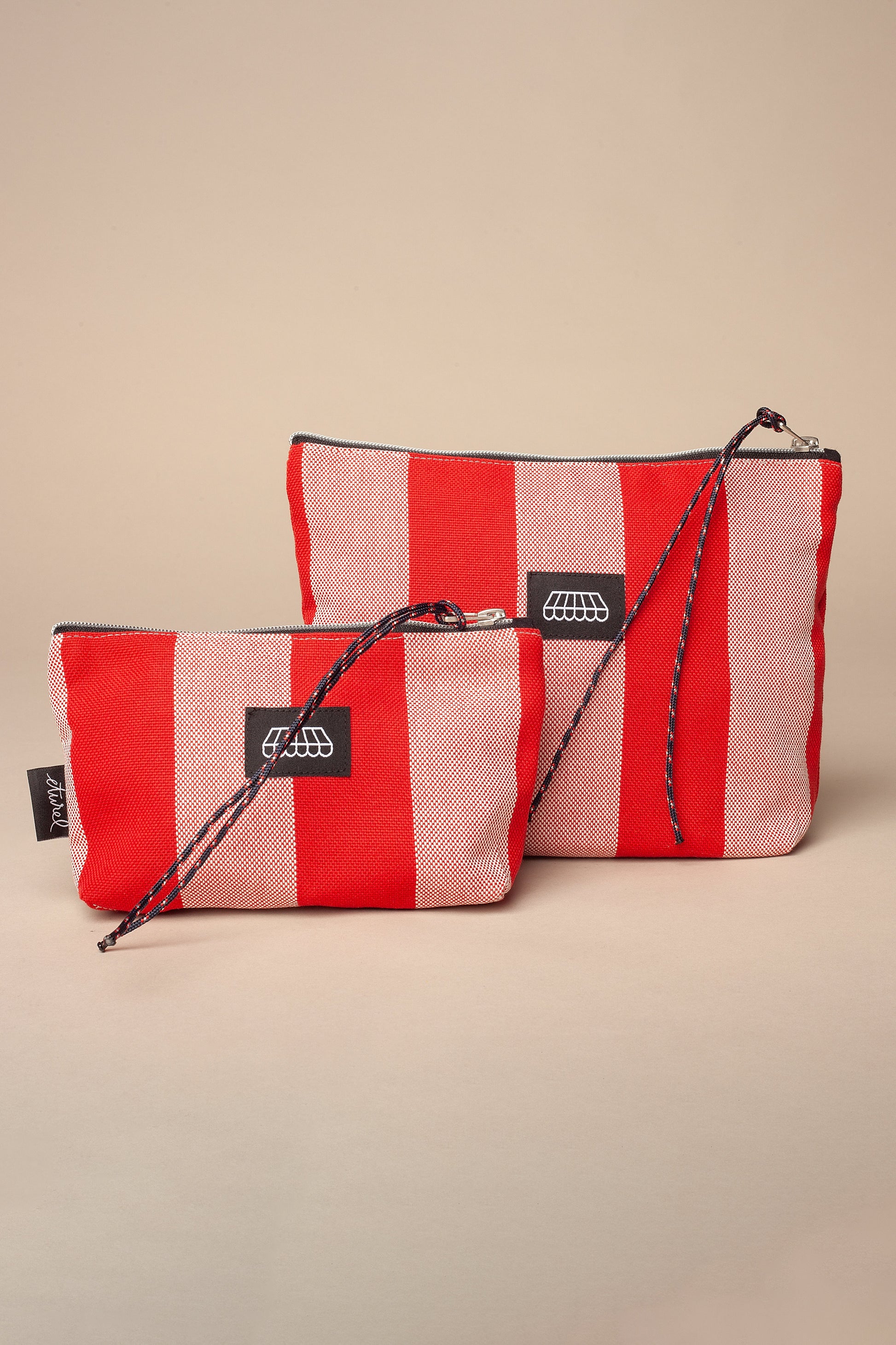 Esta pareja de lona rojo de rayas es como llevar un trocito de verano a todas partes. Inspirado en los tradicionales toldos de los pueblos y barrios, su diseño evoca el brillo y la vitalidad de las tardes soleadas. Con su práctico tamaño y resistente tejido, es perfecto para guardar tus productos esenciales, ya sea en la playa, en un paseo o en un viaje. Su estampado de rayas rojo, que recuerda a los colores que adornan los mercados y calles del verano, aporta ese toque único que hace que cada momento sea más especial.