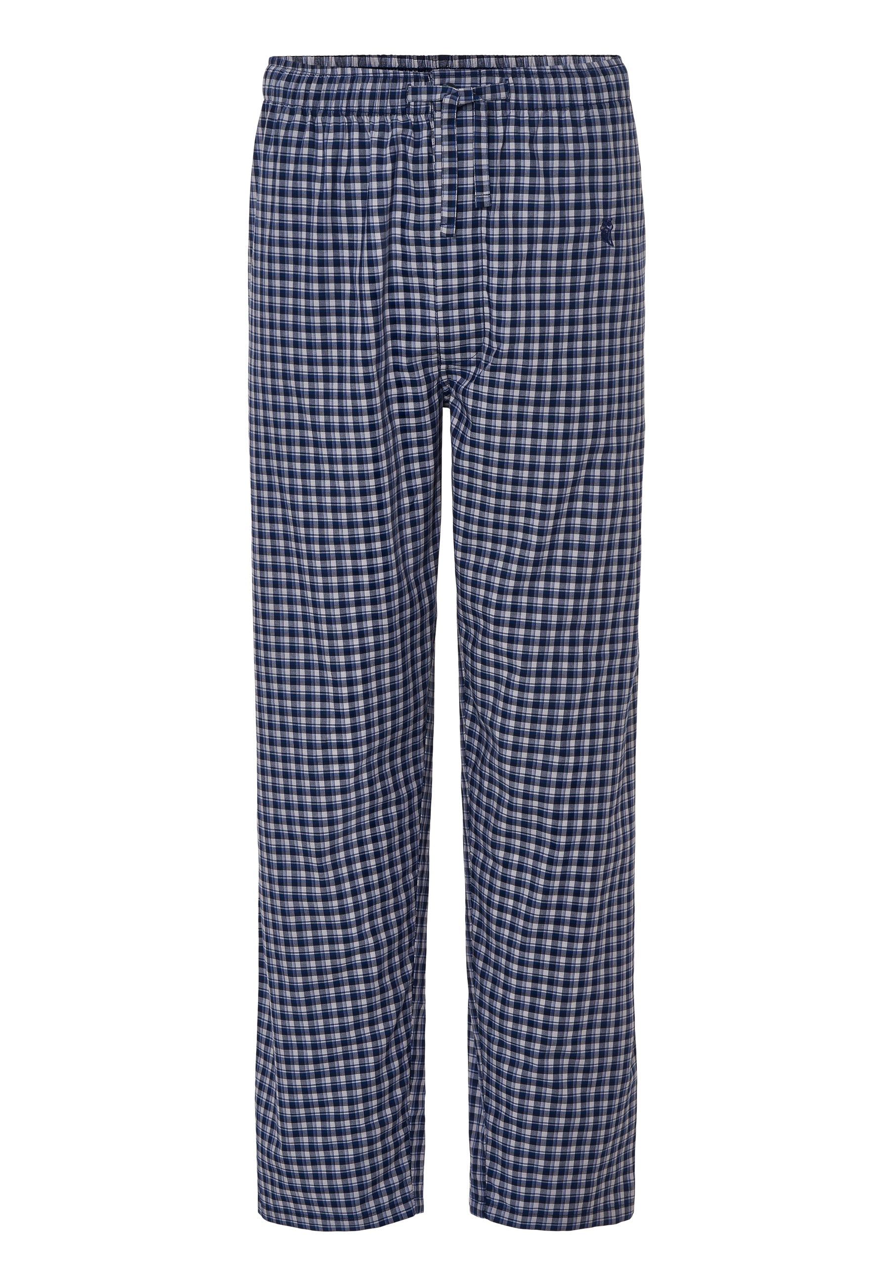 Pantalón largo premium de pijama de hombre a cuadros azules y grises. Edición "Essentials", confeccionados en tela popelín, 100% algodón. Fit regular, con perneras holgadas. Pantalón agradable al tacto, muy confortable. Logo bordado en la parte superior izquierda del mismo. Diseñado con dos costuras con dos bolsillos laterales y bragueta a dos botones verticales cubierta por tela, que permite desabrocharlo por completo. Cintura elástica con cinta personalizada que puede proporcionar un mayor ajuste del pantalón.