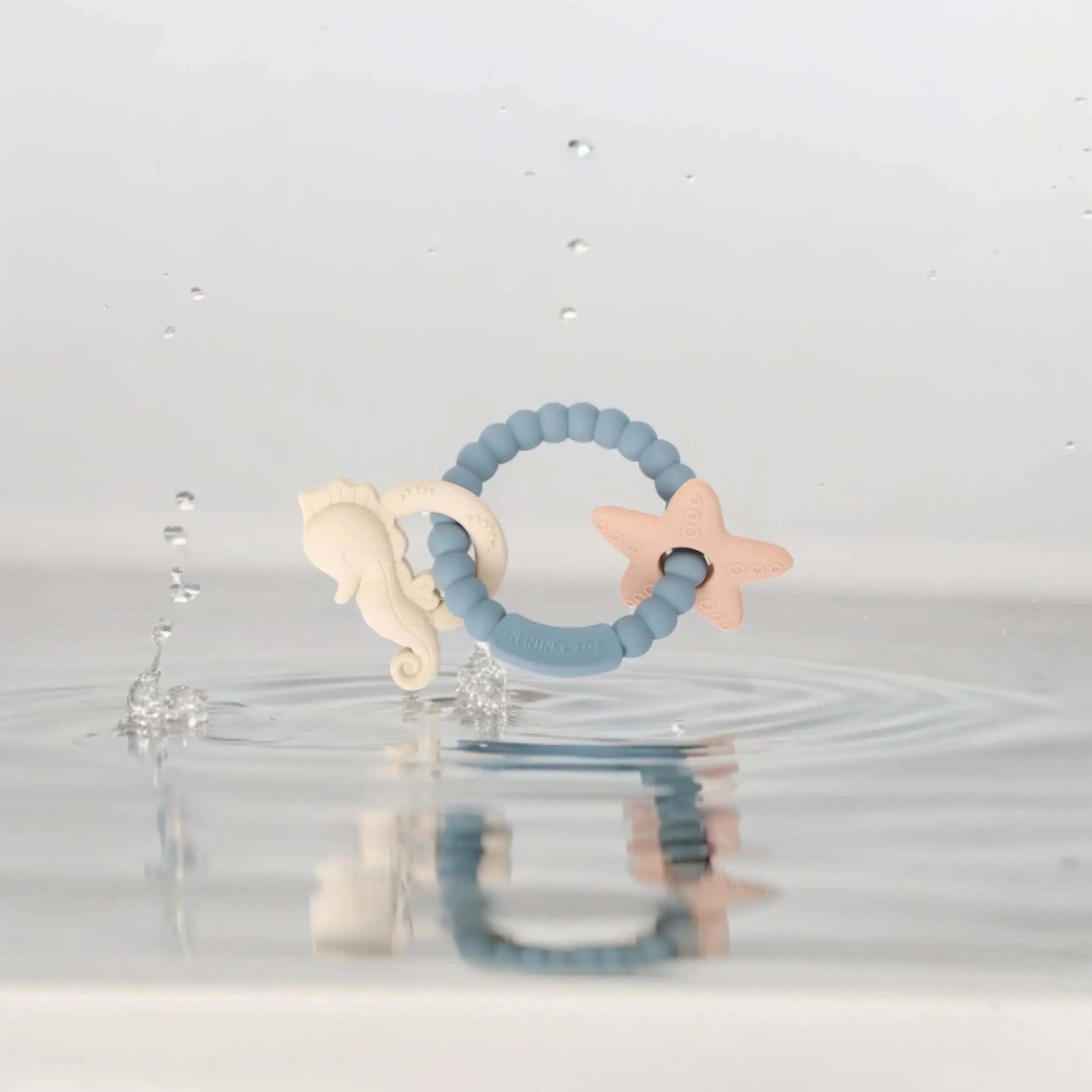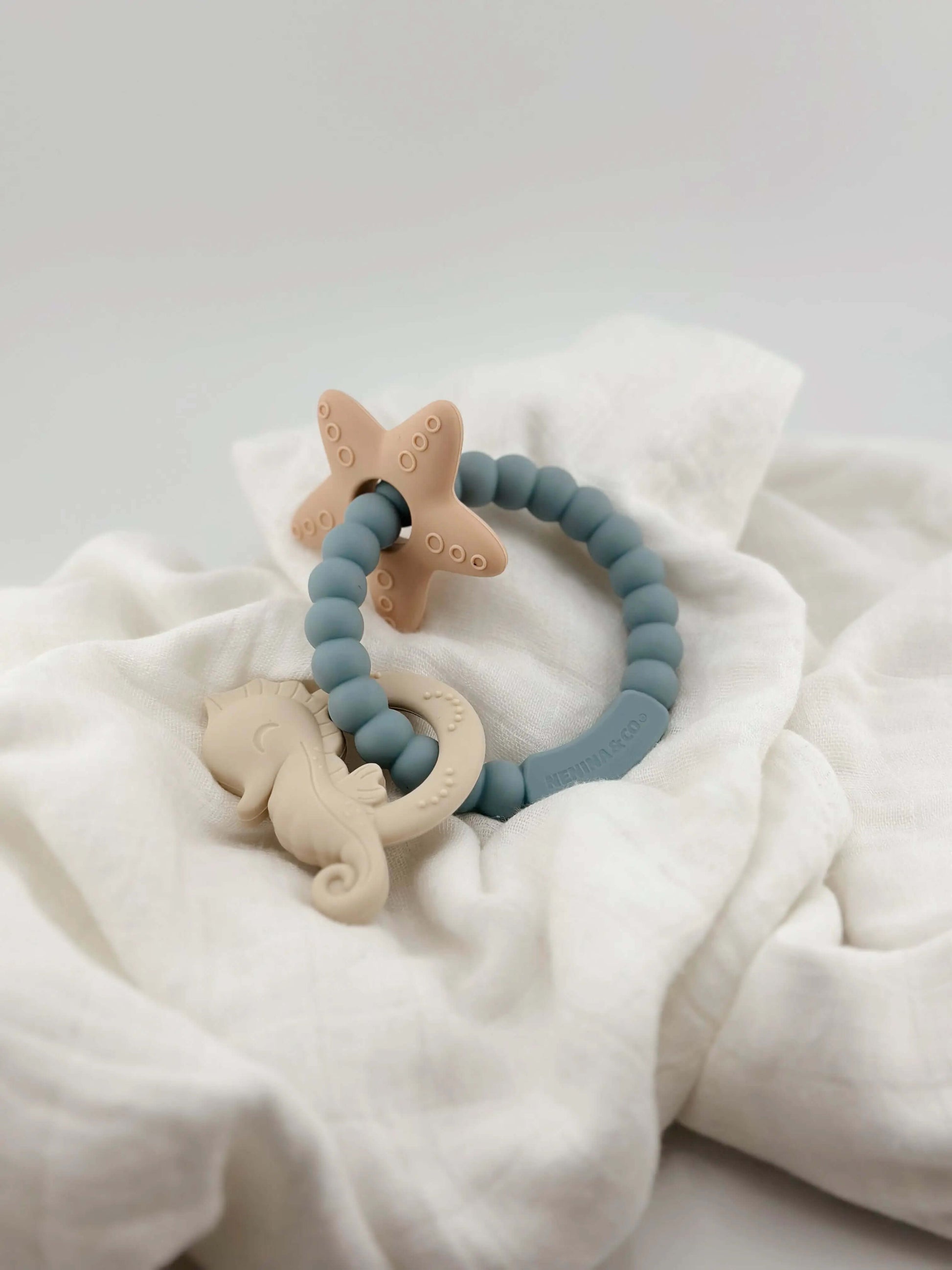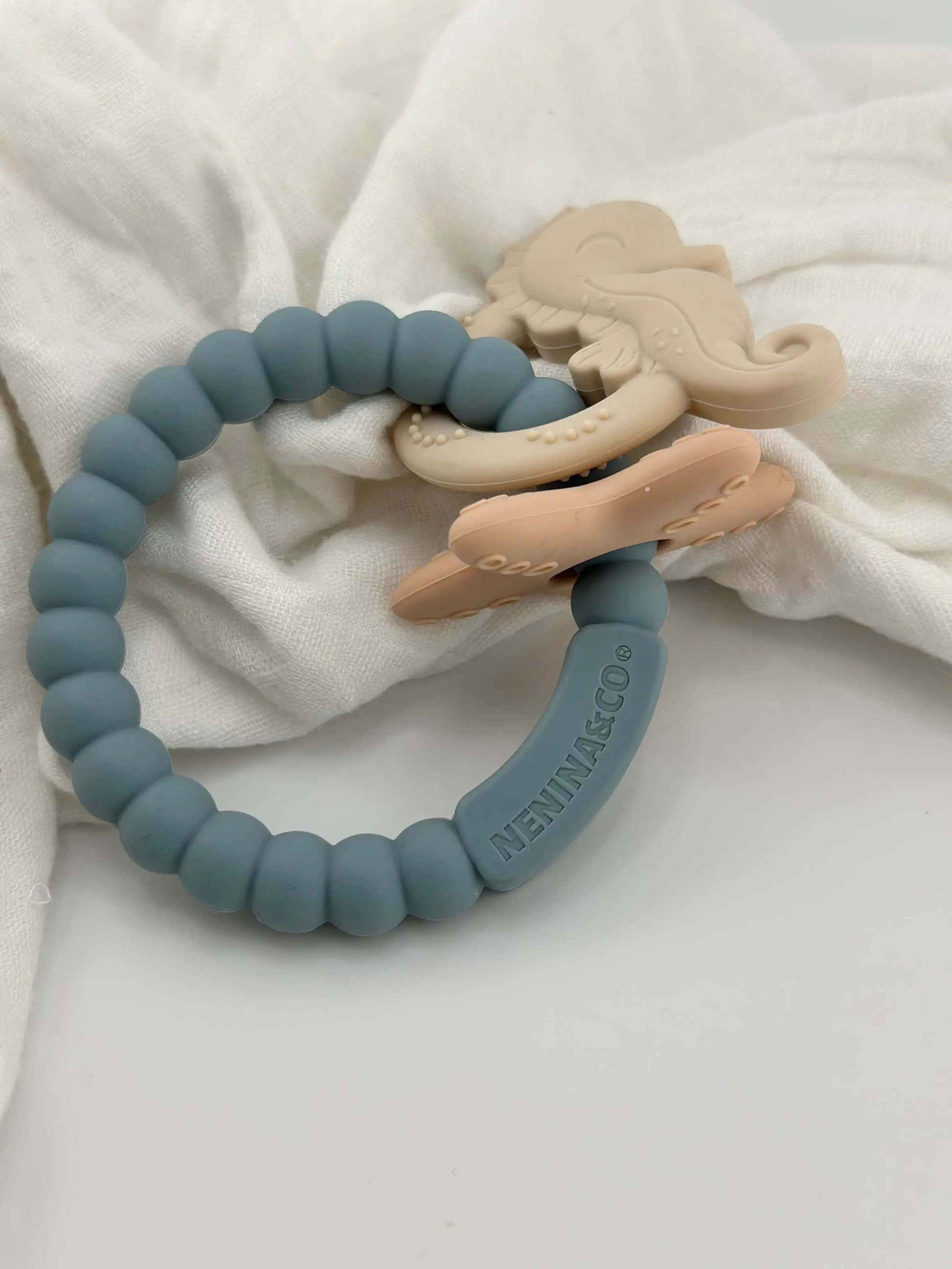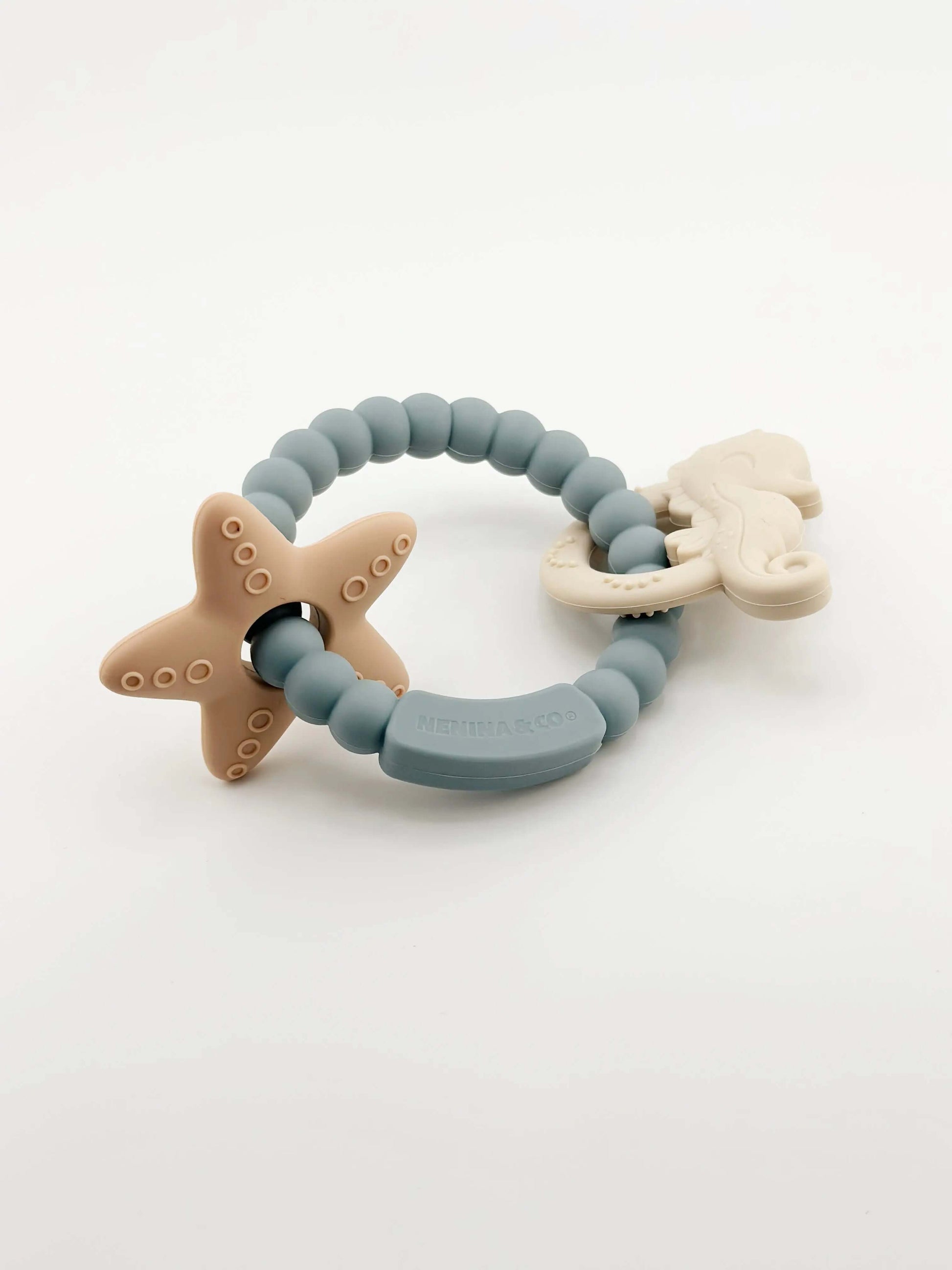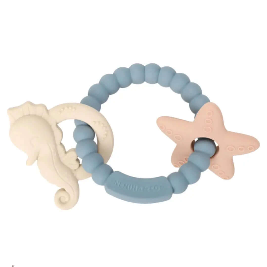 El mordedor Marino Nenina & Co es ideal para aliviar el dolor de las encías de tu bebé. Ayuda a los más pequeños a explorar formas y texturas ricas en sentidos sensoriales con su anillo de dentición que contiene un bonito caballito y estrella de mar . Hecho de 100% silicona orgánica de  grado alimenticio. Los bebés en dentición disfrutarán hundiendo sus encías en el material suave que satisface la necesidad natural de masticar. Con 3 colores empolvados y  texturas con relieve alrededor del anillo, este juguete inspira momentos de diversión y crea oportunidades de descubrimiento.
