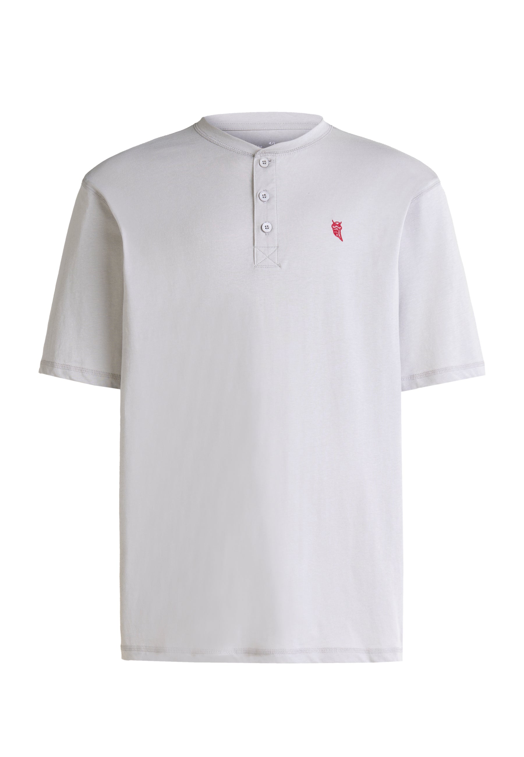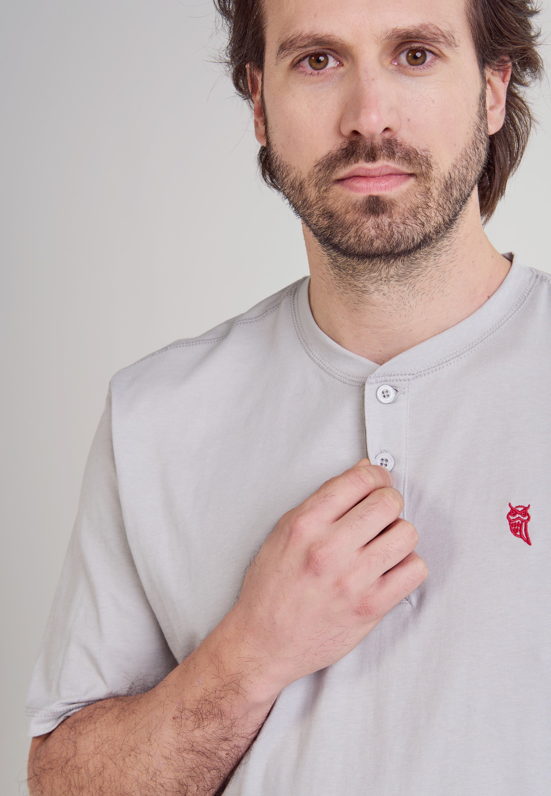 Camiseta básica lisa de manga corta de entretiempo de punto, 100% algodón en 160gr/sqm. Edición "Essentials". Color gris con cuello tapeta a tres botones personalizados a juego. Logo bordado en el pecho. Camiseta multiuso, para interior como exterior, que proporciona comodidad, suavidad y confort. Fresca, agradable al tacto y absorbente.