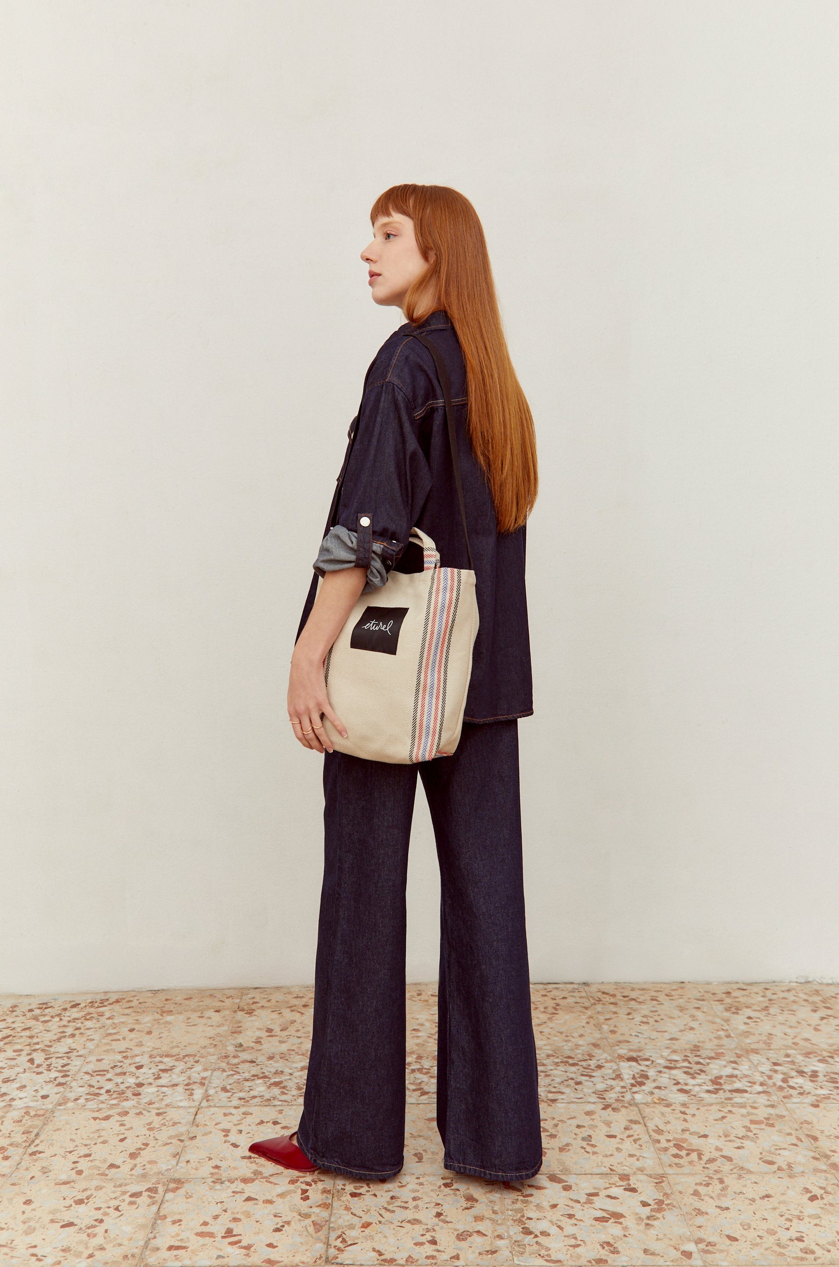 ¡Lánzate a la calle con nuestra tote bag cruzada de sarga de burgos! Su asa corta y bolsillo con cremallera son perfectos para guardar todas tus pertenencias con seguridad. Además, su tela recupera los tradicionales sacos de trabajo y labores. ¡Es tremendamente única y totalmente unisex!
