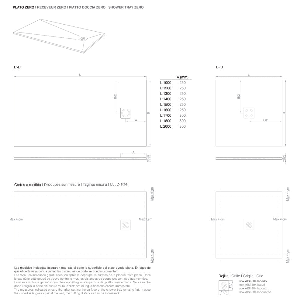 - Cortes: es posible cortar el plato de ducha (corte a realizar por su personal de obra) consultar en la ficha técnica las medidas máximas de corte. Herramienta recomendada: Radial con disco de diamante.