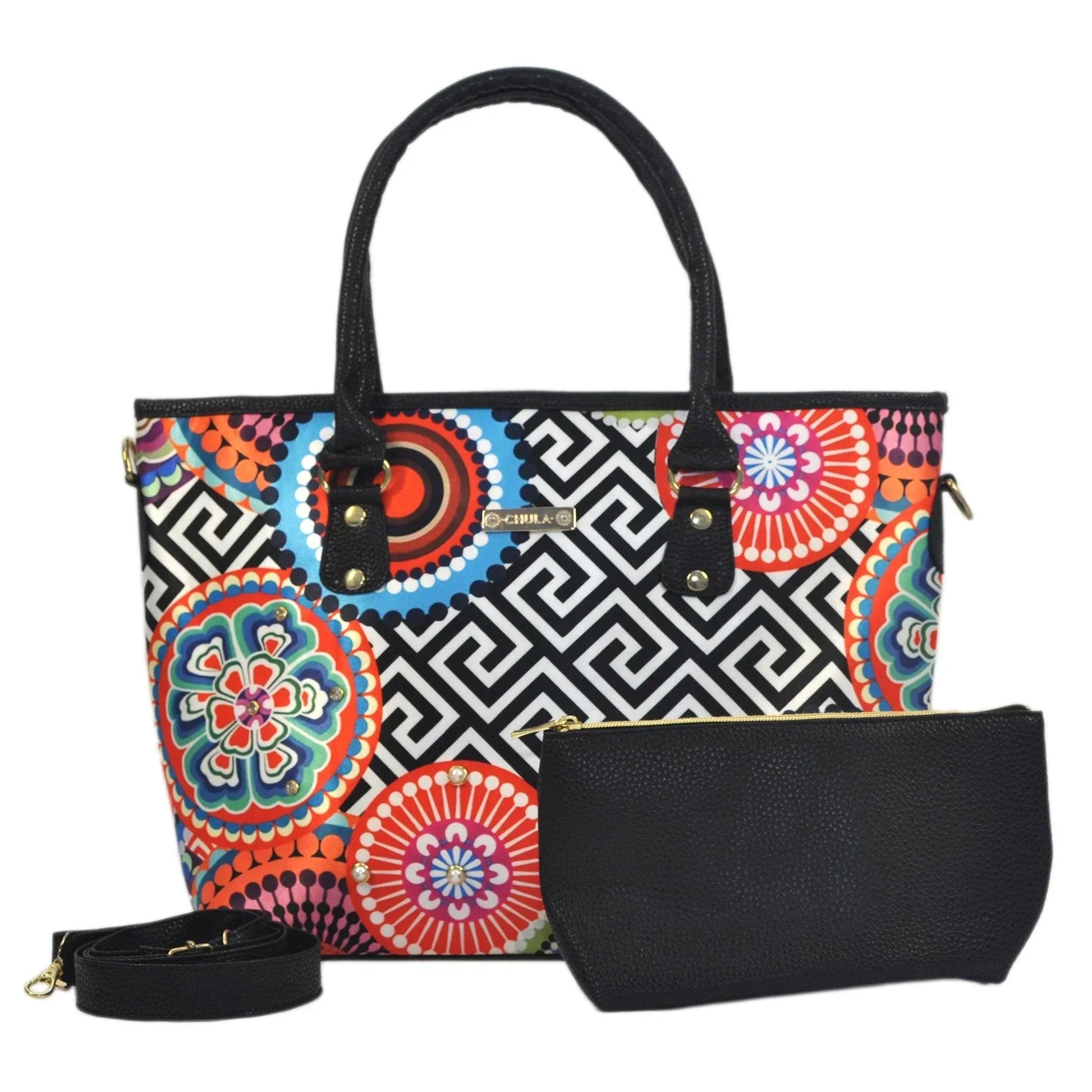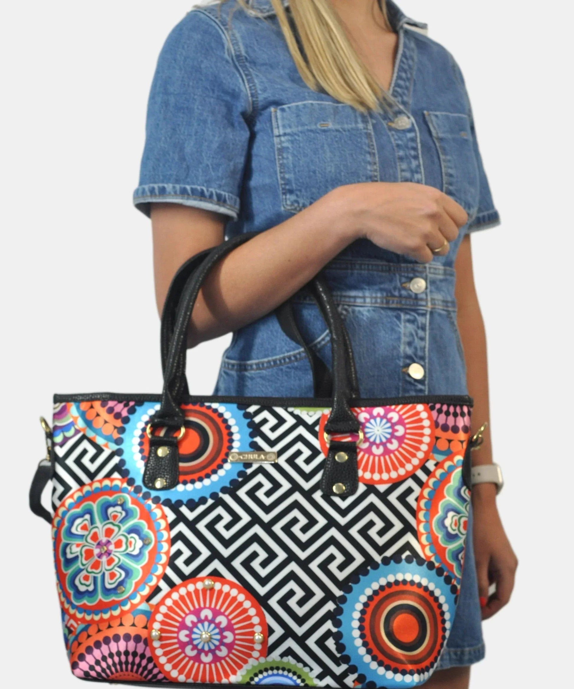 El diseño exclusivo de este bolso combina círculos con mandalas de colores vivos, resaltando una greca elegante en blanco y negro que añade un toque de distinción a tu estilo. Perfecto para cualquier ocasión, este bolso es altamente combinable, permitiéndote crear looks que reflejen tu personalidad única y vibrante.