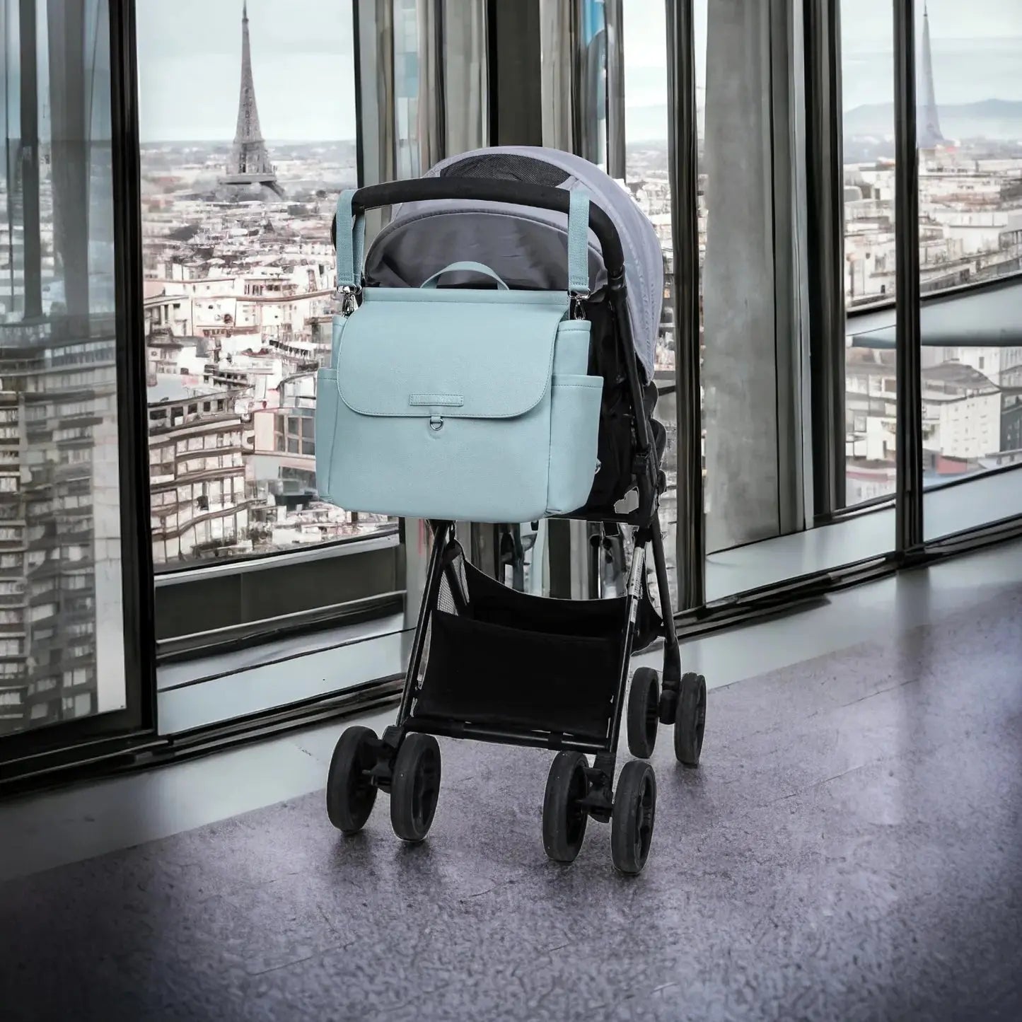 Incluye tiras adicionales para colgar del carro, convertirlo en mochila y en bolso con tira para colgar de tu hombro. Ademas incluye  cambiador de Eco piel impermeable para cuidar a tu bebé y cambiarlo donde sea que estes.