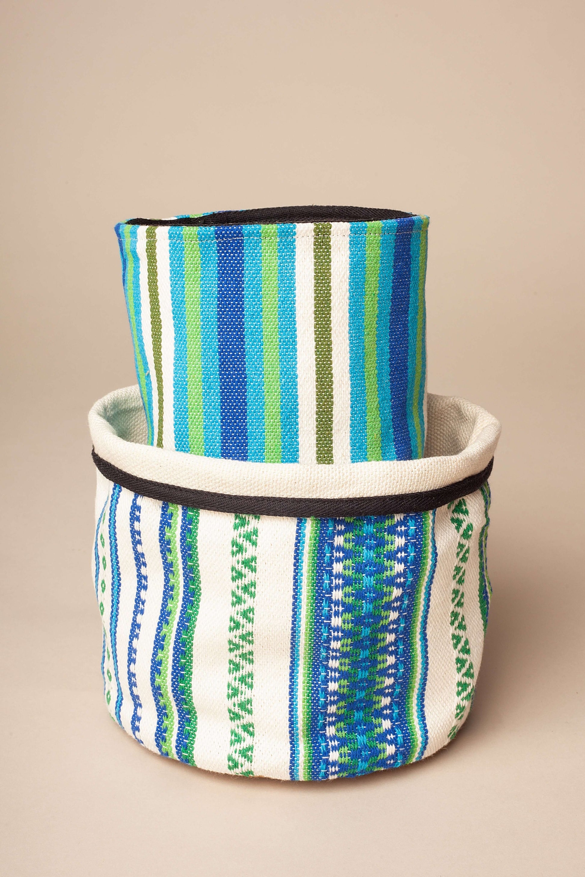 Estos dos cestos, que combinan el tejido canario y el tejido manchego, son la esencia misma de la colección Hierbabuena: frescura, dinamismo y ese toque único del verano. Los tonos brillantes de verde y azul, que recuerdan al frescor de la hierbabuena en una tarde calurosa, se mezclan con la textura rústica de los tejidos tradicionales, creando una pieza con carácter. Perfectos para cualquier rincón, estos cestos no solo te ayudan a organizar, sino que también añaden un aire desenfadado y alegre, ideal para aportar color y frescura a tu hogar en cualquier época del año.