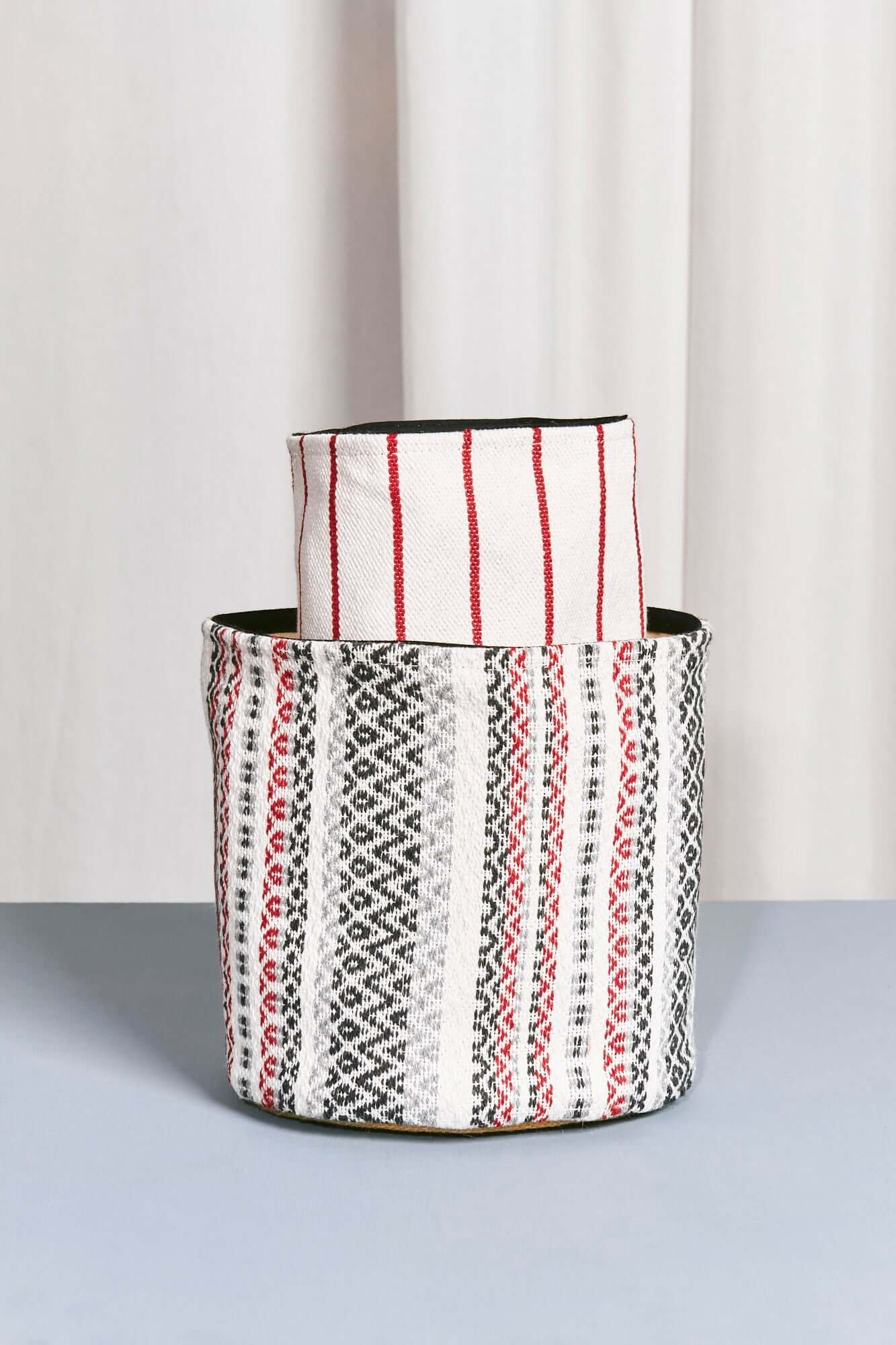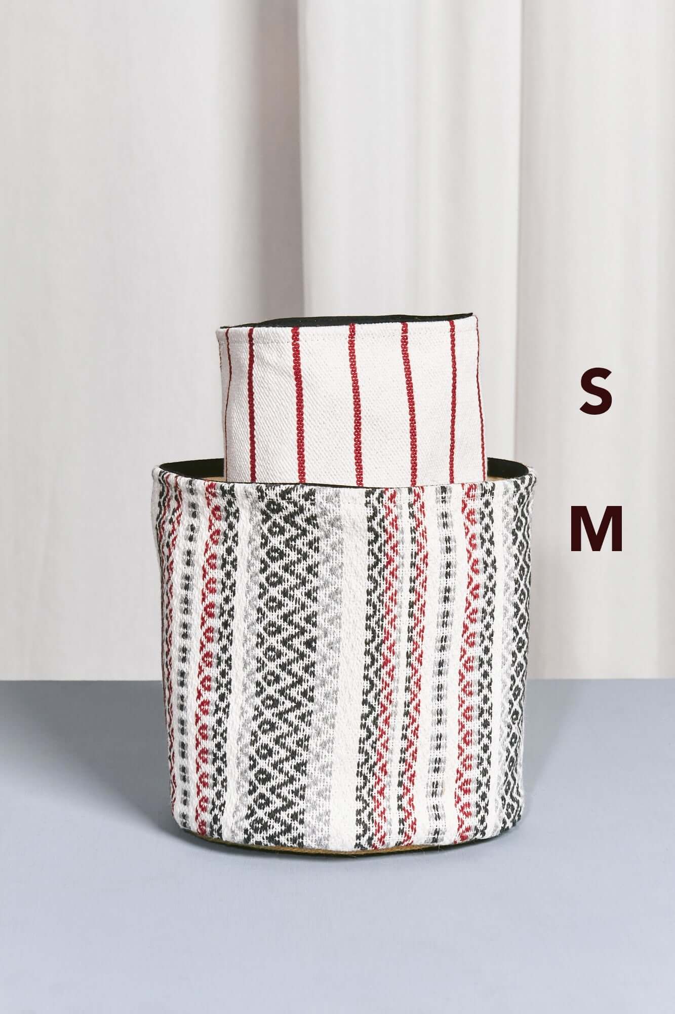 Cesto para almacenar a rayas con tonos granate, crudo y gris. Este precioso cesto lo puedes comprar en 3 tamaños diferentes según tus necesidades. Cesto confeccionado con tejido morellano perfecto para combinar con cestos de diferentes estampados y aportar frescura y color al hogar. Además, todos nuestros cestos cuentan con forro para proteger su interior y puedas llenarlo de tus pertenencias.