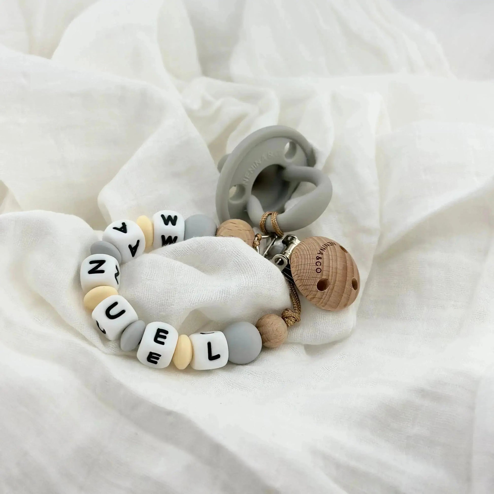 Chupetero Personalizado Gris. con Nombre en Silicona Orgánica | Nenina & Co.