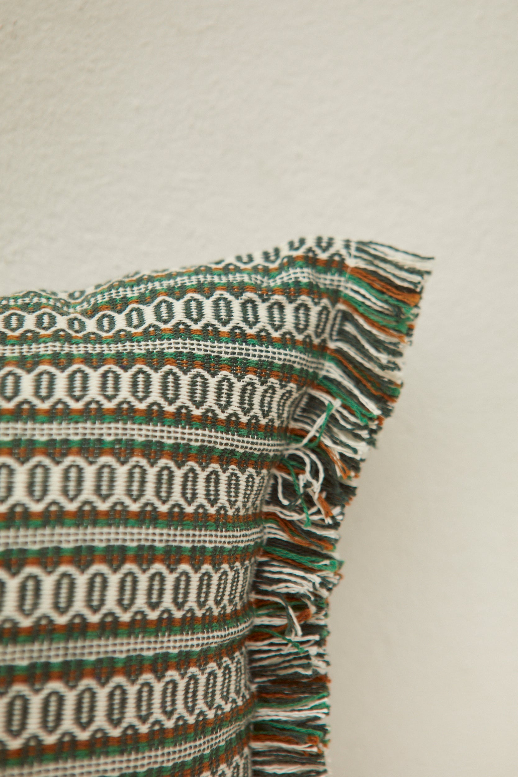 Su estampado dará un toque cálido a tu hogar. Su tejido suave y cómodo, y sus flecos añadirán un pequeño detalle extra. Tejido de manera artesanal y cosido por nosotros, combina perfectamente con otros cojines de nuestra gama, perfectos para renovar tu hogar.