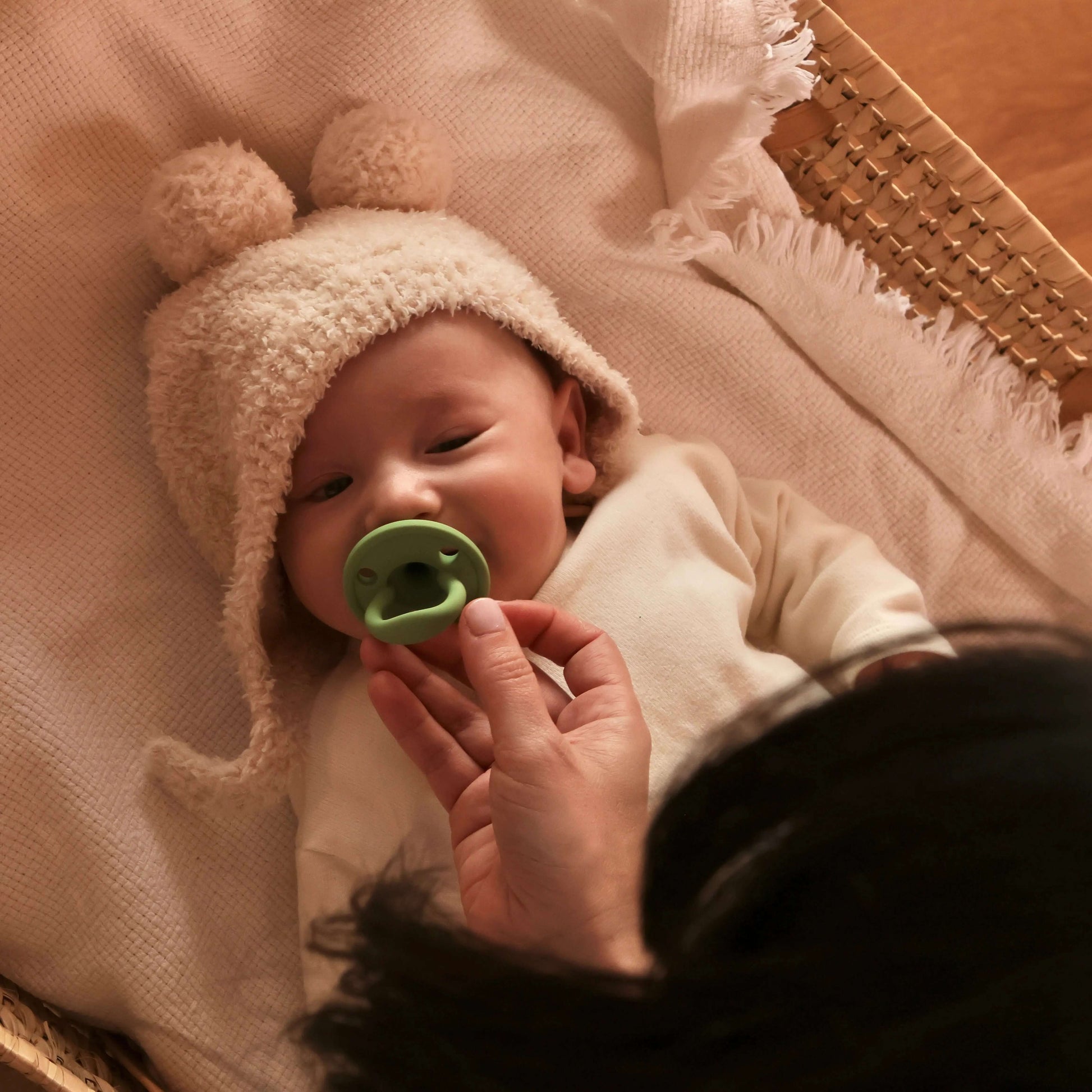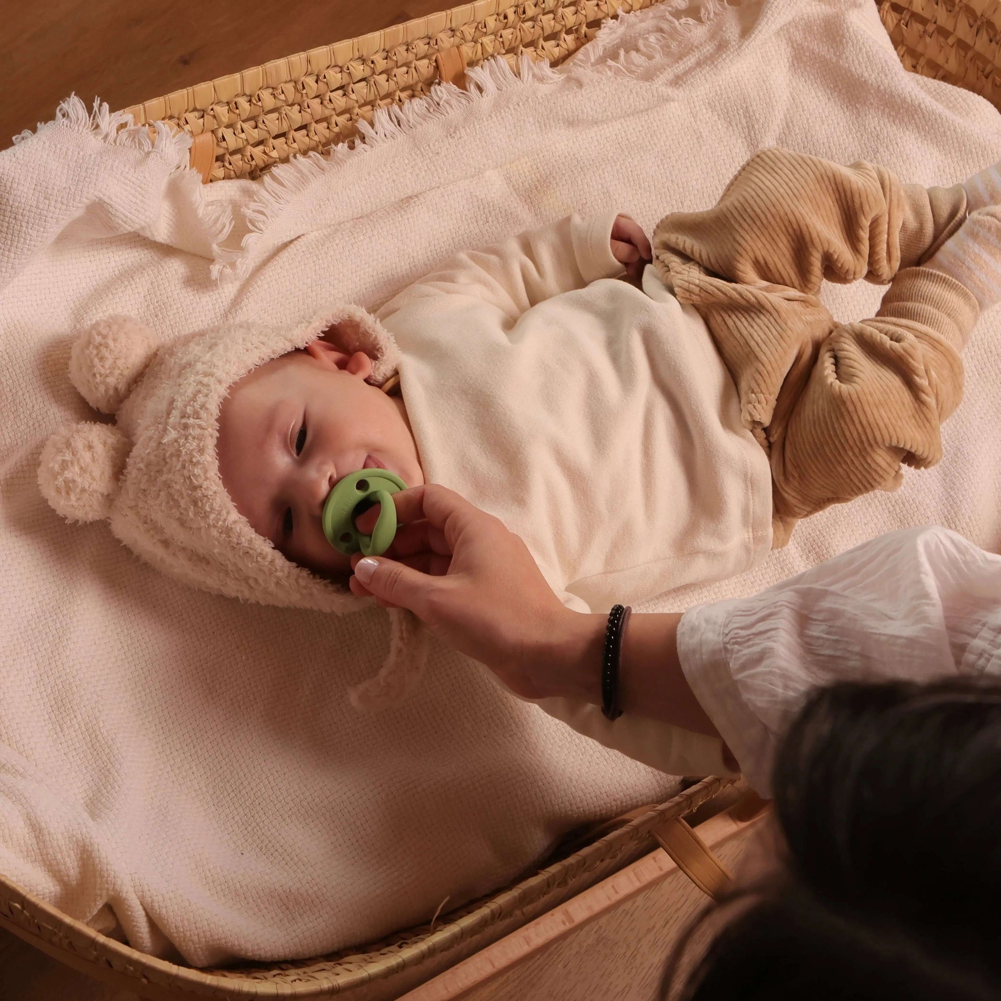 Kit Nenina & Co – Oliva | 2 Chupeteros Algodón Orgánico + 1 Chupete Clásico de Silicona