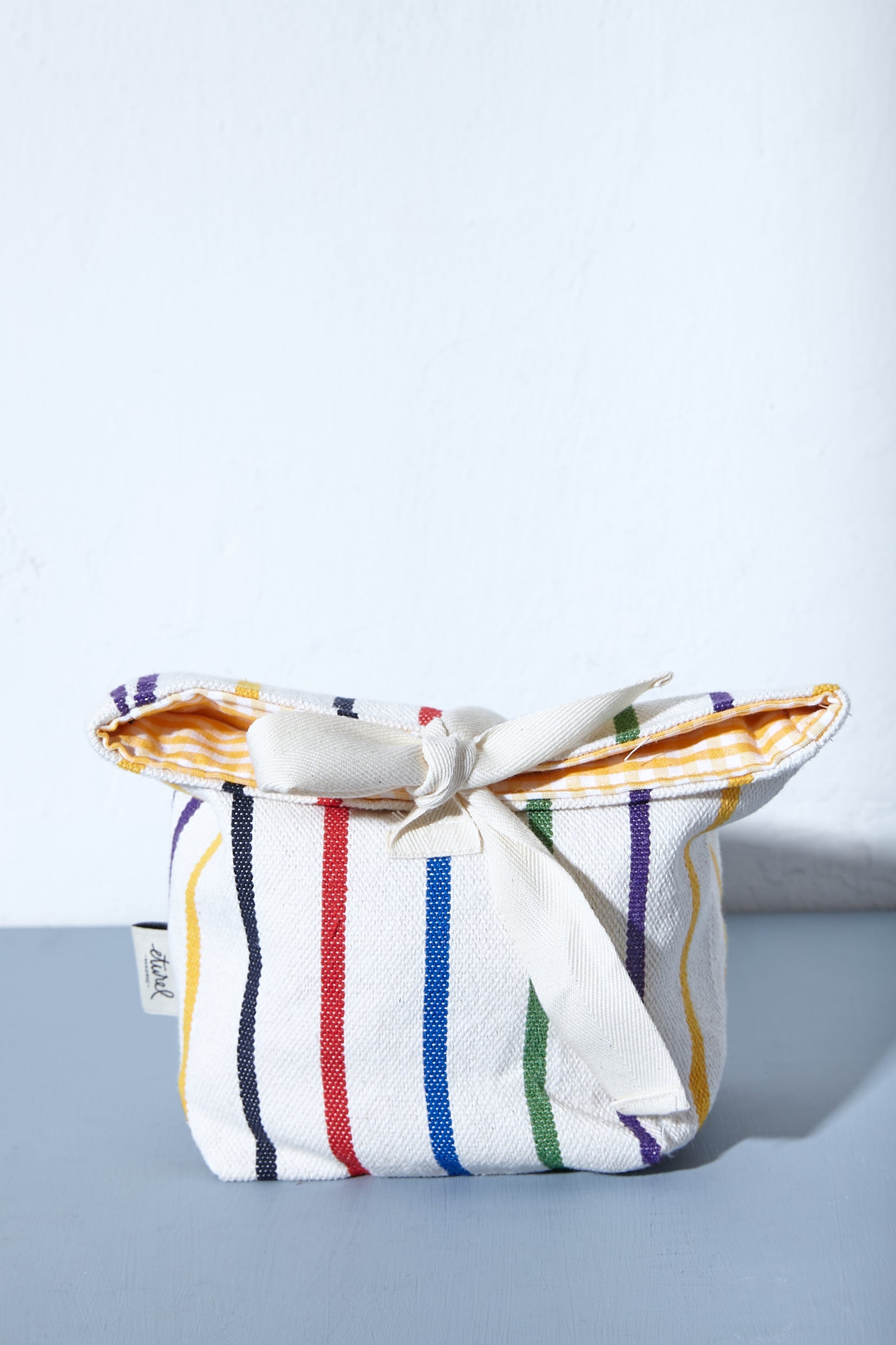 • Cierre con dos lazos de cinta de algodón cruda.