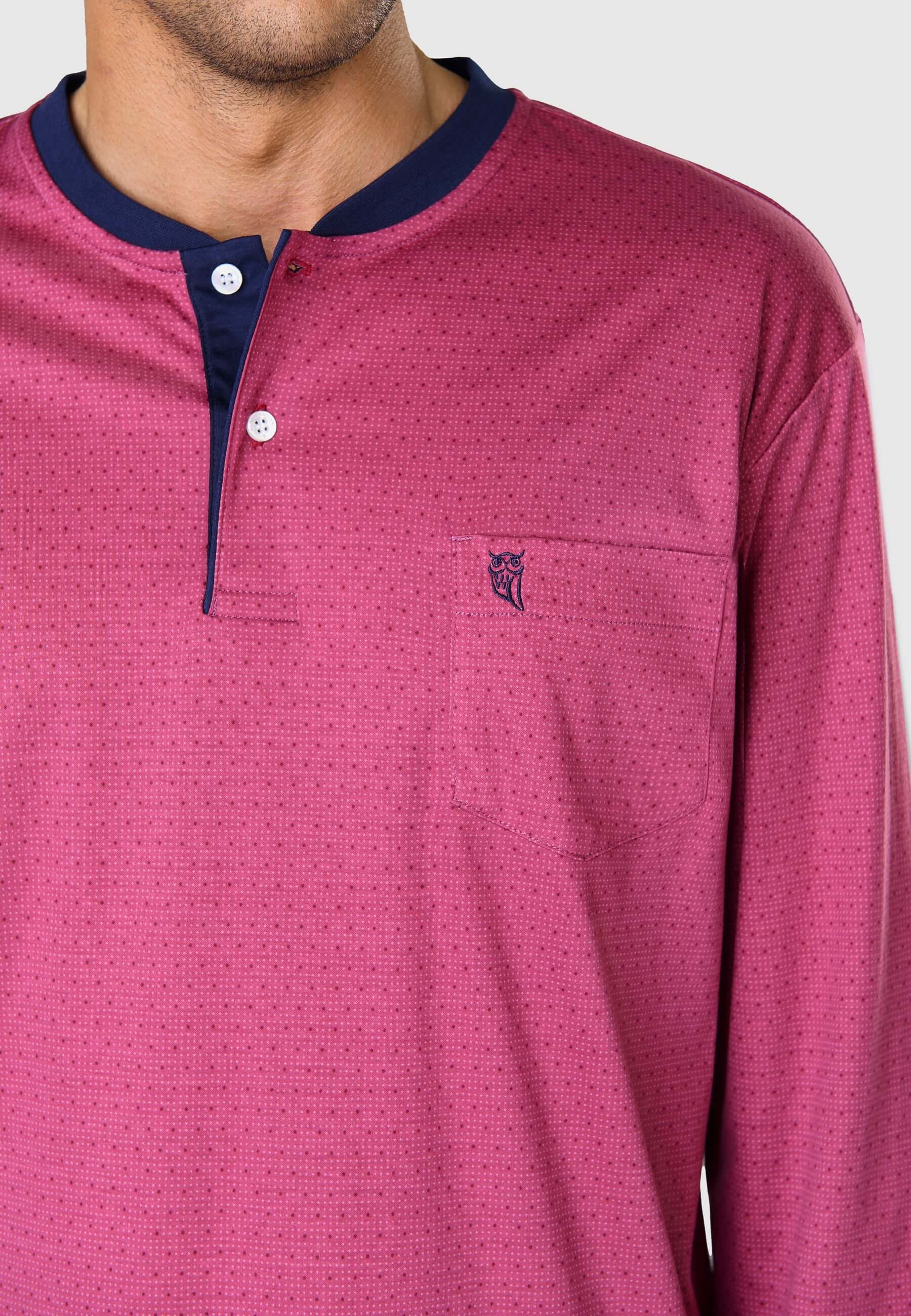 Set de pijama de hombre largo premium de entretiempo con top granate estampado a puntitos. "PRODIGY Edition", made in Portugal. Fit regular, con el mismo diámetro en las mangas y perneras, de tallaje holgado. Parte de arriba de manga larga de punto en 167gr/sqm 100% algodón, con cuello tapeta y cierre a botones personalizados con el nombre de la marca. Logo bordado en el pecho. Pantalón largo liso marino de 193gr/sqm 100% algodón supima, uno de los mejores algodones del planeta, que produce una fibra más suave y brillante de máxima calidad. Sin bolsillos y sin bragueta.