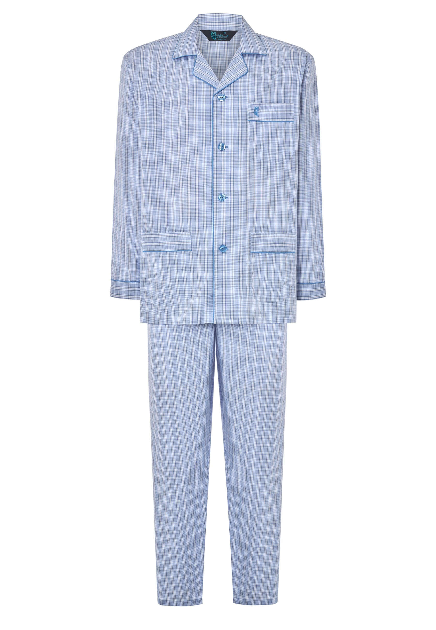 Set de pijama largo clásico de hombre de entretiempo a cuadros celestes delimitados por cuadros grises. Edición "Essentials", confeccionado con tela popelín 100% algodón. Tejido que aporta suavidad y confort. Fit regular, con el mismo diámetro en las mangas y perneras, de tallaje holgado. Chaqueta con cuello solapa y cierre a botones personalizados con el nombre de la marca, con un bolsillo en el pecho y dos bolsillos a la altura de la cadera. Logo bordado en el pecho. Pantalón largo a juego de una sola costura sin bolsillos con bragueta a dos botones verticales cubierta por tela, que permite desabrocharla por completo. Cintura elástica con cinta hecha de la misma tela que permite un mayor ajuste del pantalón.