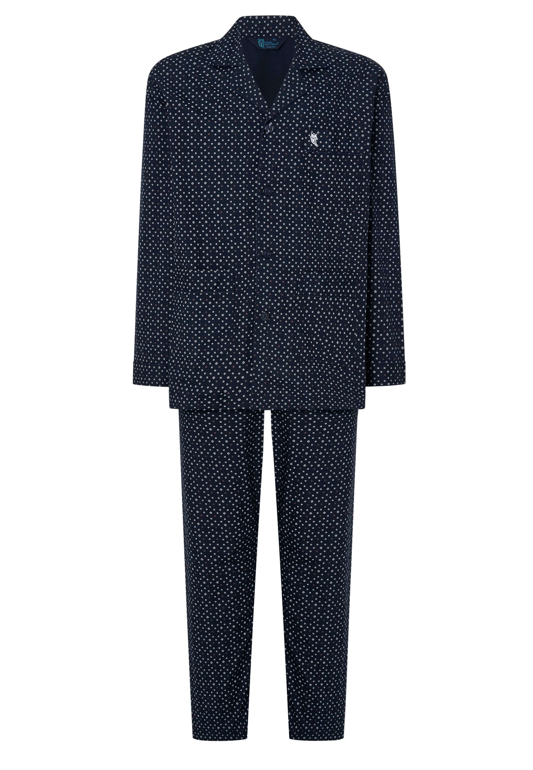 Set de pijama largo clásico de hombre de entretiempo estampado marino. Edición "Economy", confeccionado con tela popelín 65% poliéster y 35% algodón. Calidad al precio más reducido. Fit regular, con el mismo diámetro que las mangas y las perneras, holgado. Chaqueta con cuello solapa y cierre a botones personalizados con el nombre de la marca, con un bolsillo en el pecho y dos bolsillos a la altura de la cadera. Logo bordado en el pecho. Pantalón largo a juego de una sola costura sin bolsillos con bragueta a dos botones verticales cubierta por tela, que permite desabrocharla por completo. Cintura elástica con cinta hecha de la misma tela que permite un mayor ajuste del pantalón.