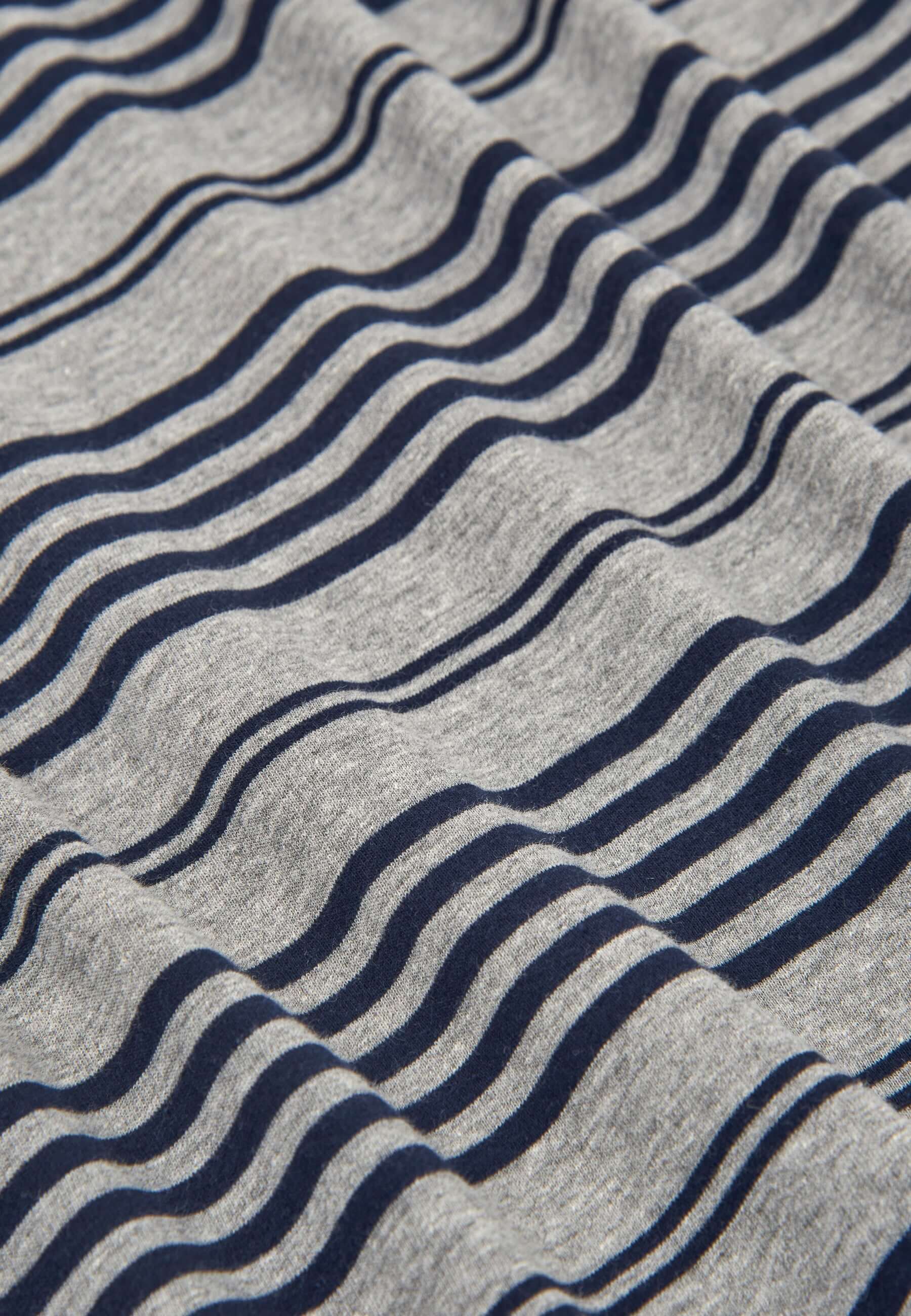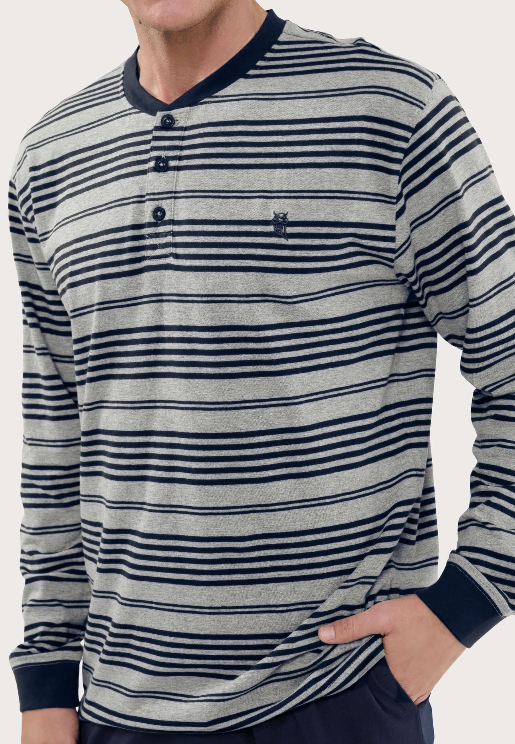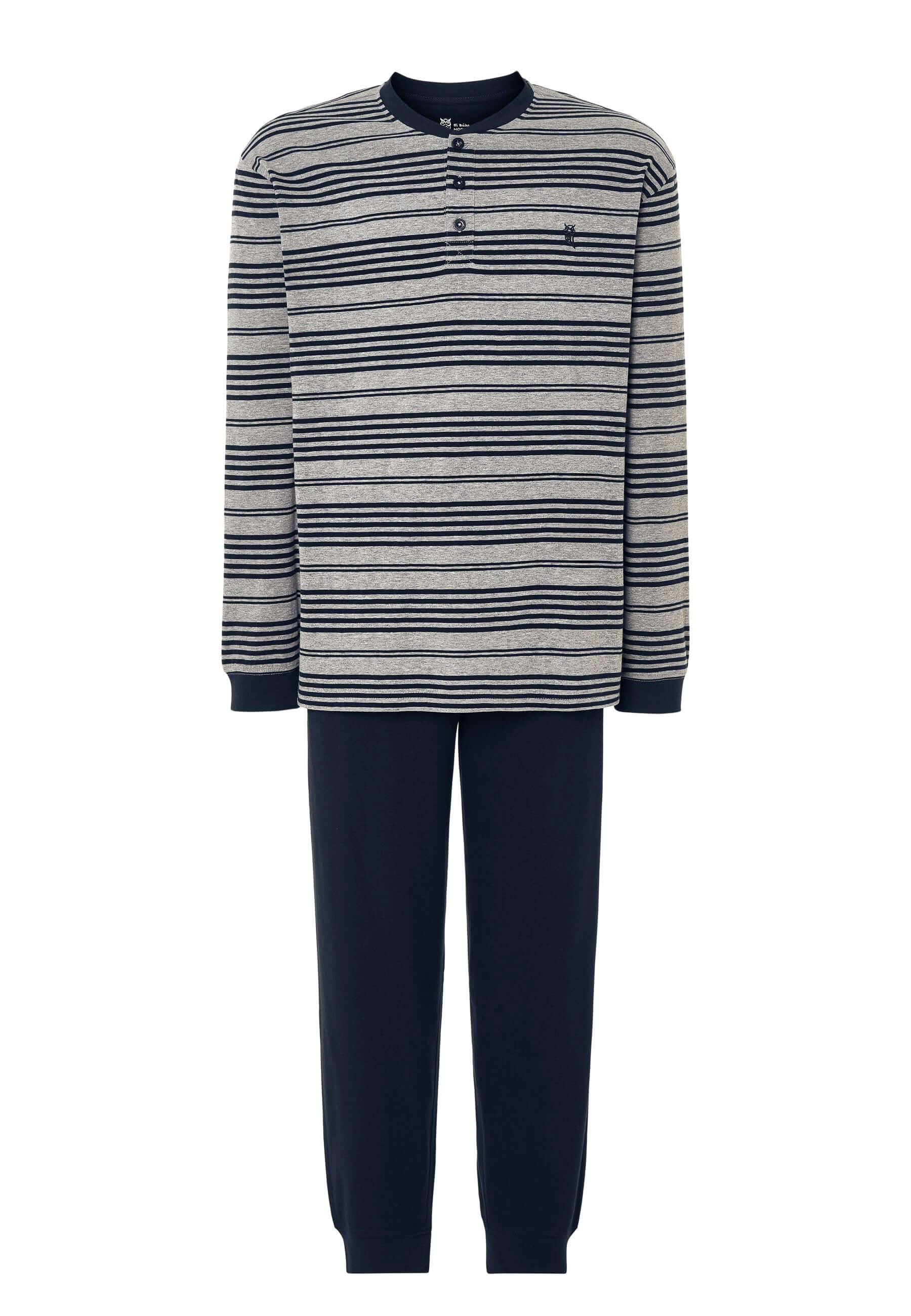 Set de pijama largo moderno de hombre de entretiempo con parte de arriba a rayas grises y negras. Edición "Essentials", confeccionado en punto de 160gr/sqm 89% algodón 11% viscosa (top) y 100% algodón (pantalón), que otorgan gran suavidad, color brillante y resistencia a la rotura. Fit regular, con el mismo diámetro en las mangas y perneras, de tallaje holgado. Un pijama confortable, elegante pero desenfadado. Parte de arriba de manga larga con cuello en tapeta a tres botones. Logo bordado en el pecho. Pantalón largo liso marino con dos bolsillos laterales a la altura de la cintura y sin bragueta.