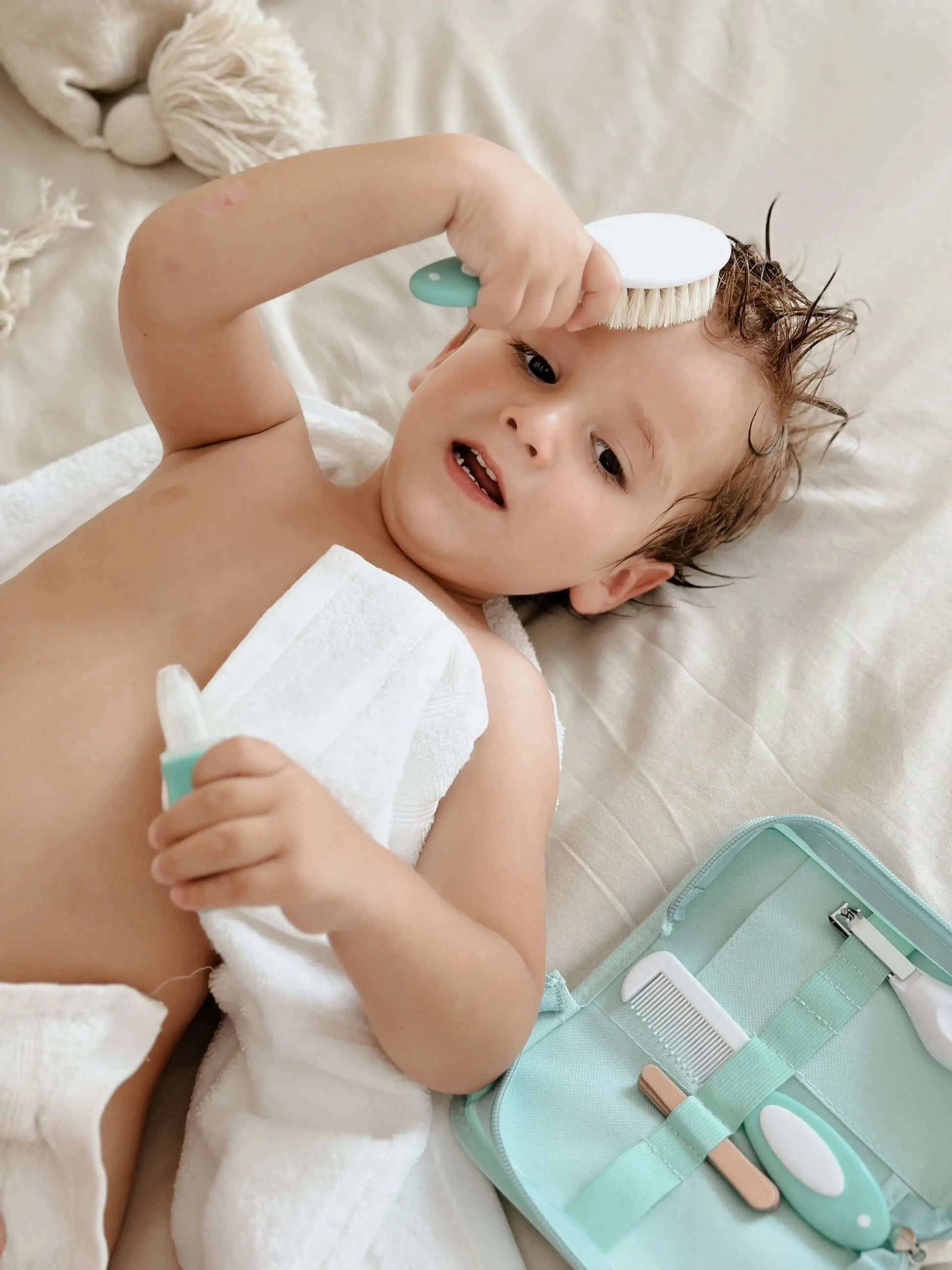 Cada accesorio está diseñado con cierre de cremallera ,Cepillo con cerdas suaves , Peine de plástico reciclado para peinar respetando el delicado cuero cabelludo de nuestros bebés, Tijeritas aptas desde el momento 0 en adelante con punta redondeada para dar seguridad a un corte sin peligro, Limas suaves para uñas finas y delicadas, Cortauñas con diseño ergonómico fácil de usar, Aspirador nasal que ayuda a despejar las vías respiratorias de manera suave y segura.