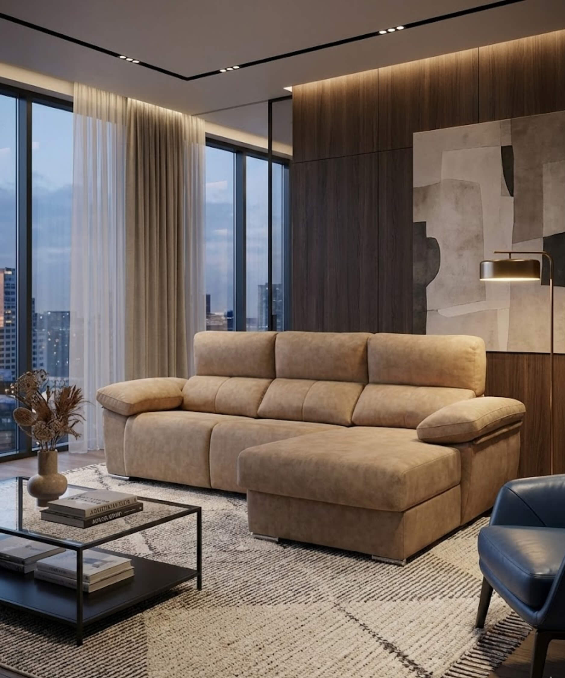 Con 3 plazas amplias, asientos relax motorizados y brazos con arcón, es perfecto para quienes valoran el confort sin renunciar a la estética. Además, su tejido antimanchas lo hace tan práctico como bonito.