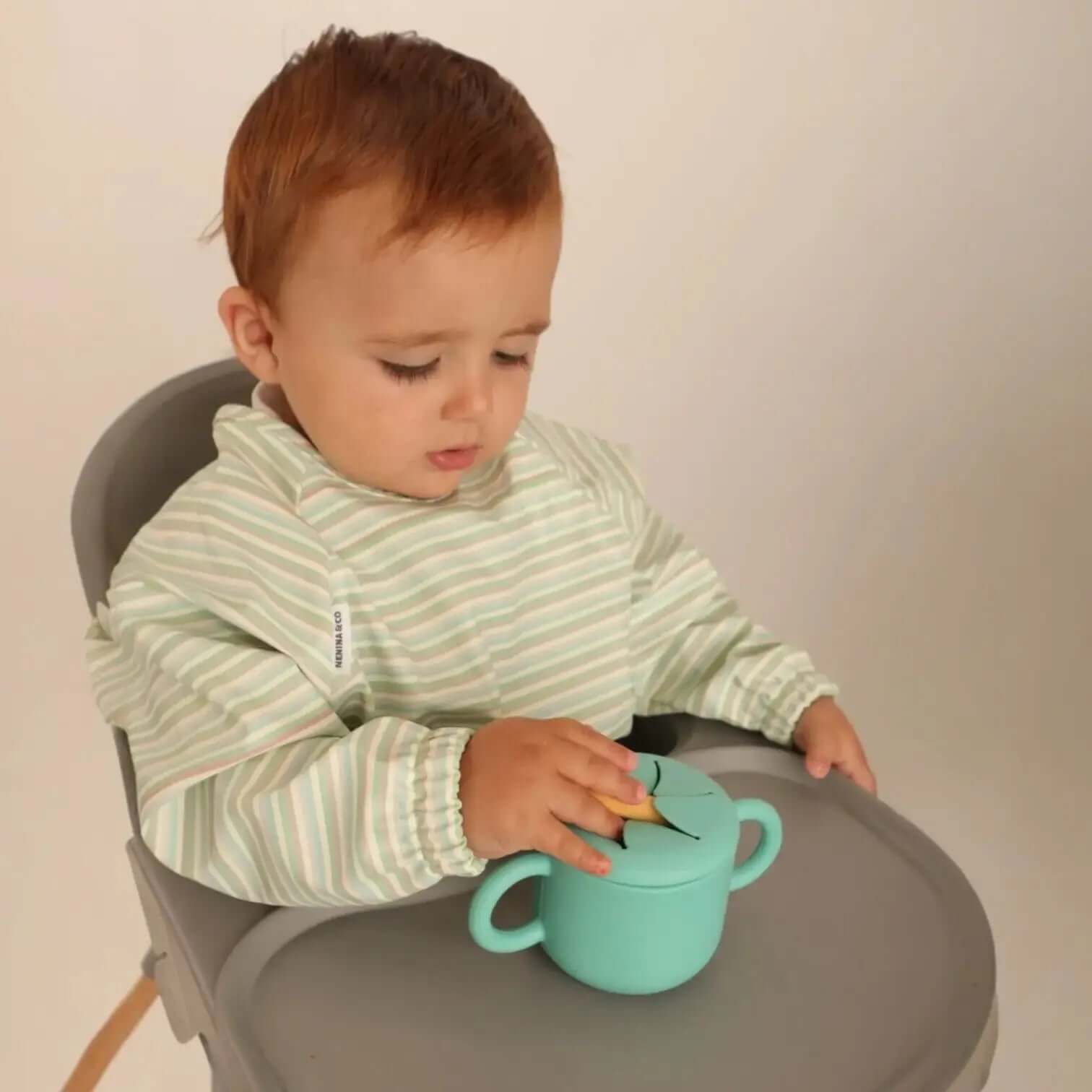 - Vaso con agarradera: Fácil de sujetar para manos pequeñas. Viene con una tapa con pico para usar como vaso para líquidos y una pajita incluida, o puedes convertirlo en un vaso para snacks con la tapa adicional.