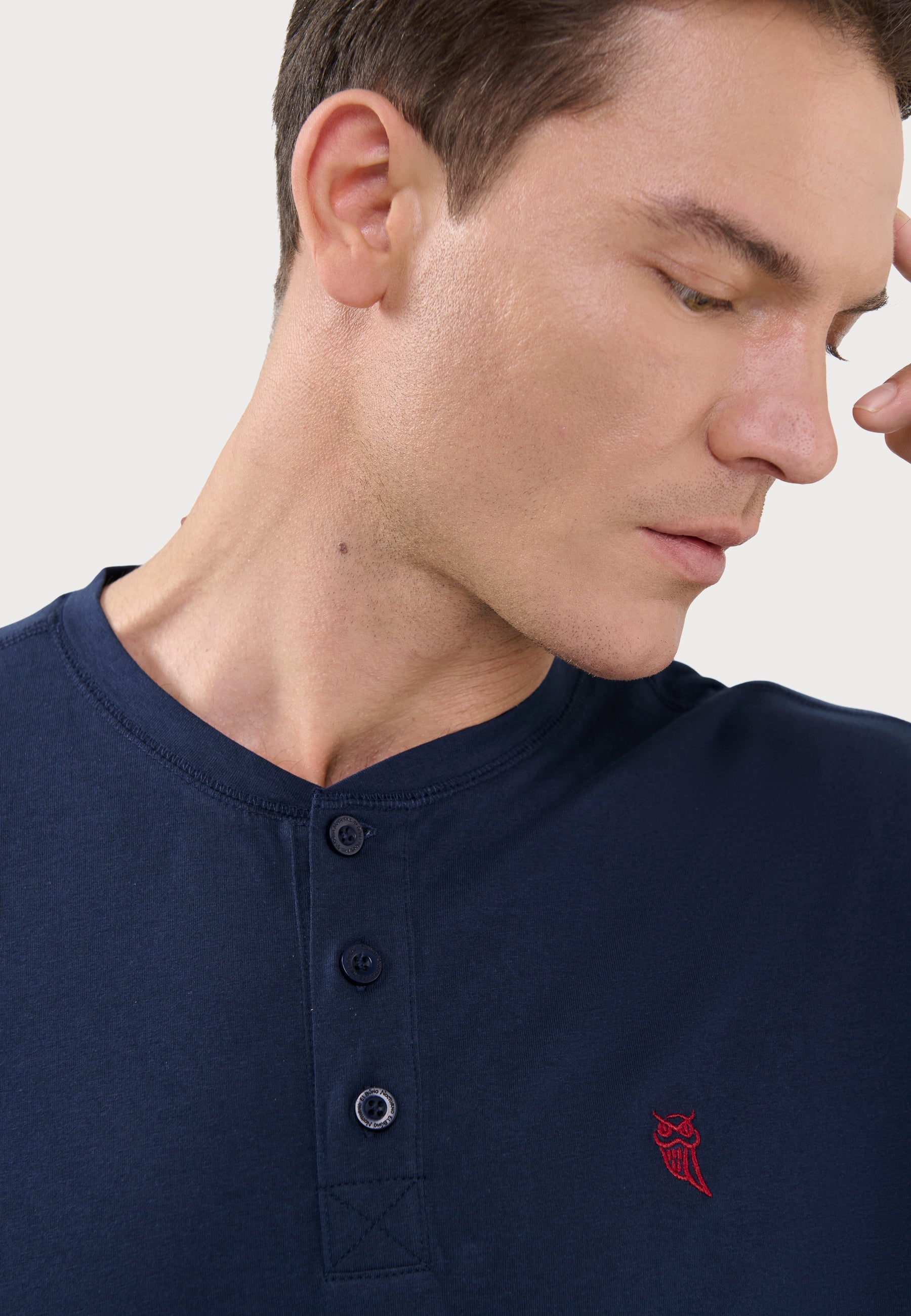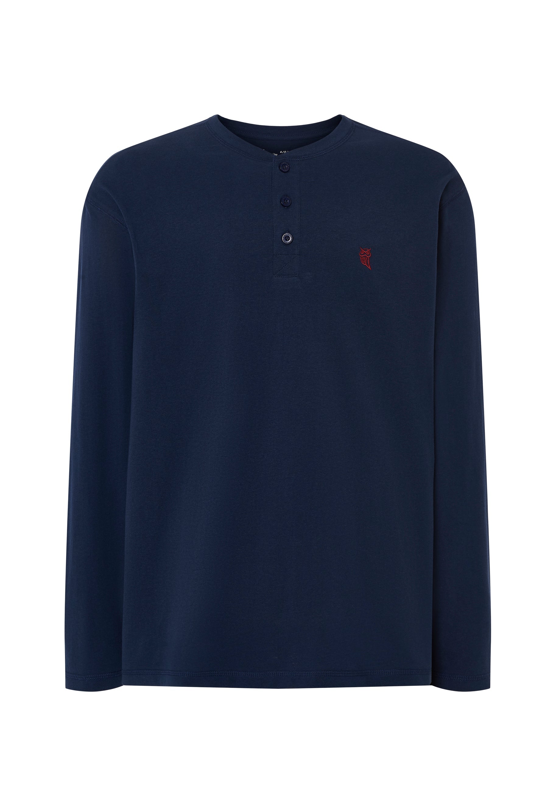 Camiseta básica lisa de manga larga de punto, 100% algodón. Edición "Essentials". Color marino con cuello tapeta a tres botones personalizados. Logo bordado en el pecho. Camiseta multiuso cómoda tanto para interior como exterior. Fresca, agradable al tacto y absorbente.