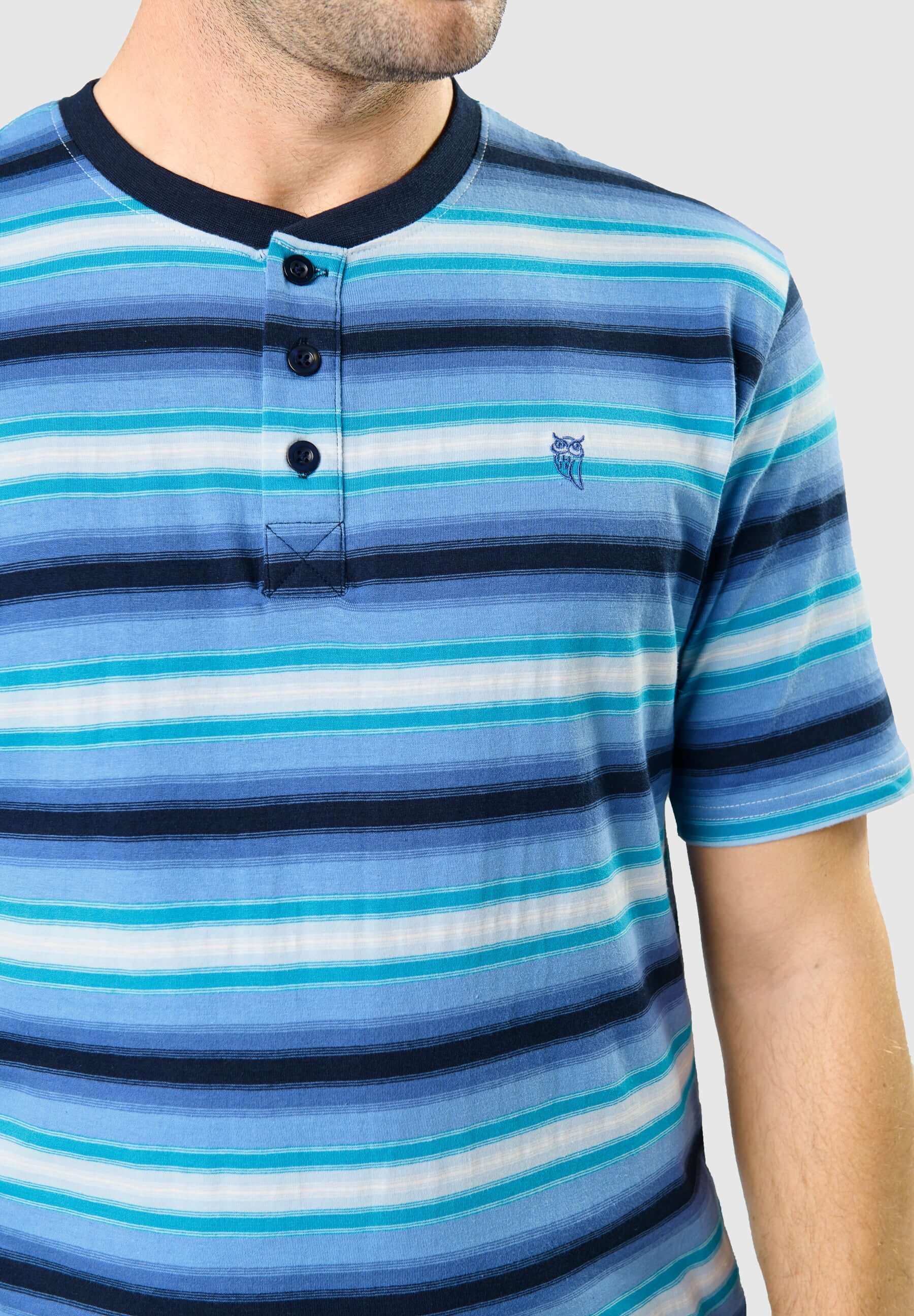 Set de pijama corto moderno de hombre de verano con parte de arriba marino con rayas verdes, blancas y moradas del mismo grosor. Edición "Essentials", confeccionado en punto de 160gr/sqm 100% algodón, que otorgan gran suavidad, color brillante y resistencia a la rotura. Fit regular, con el mismo diámetro en las mangas y perneras, de tallaje holgado. Un pijama cómodo con el que ensalzar su estilo. Parte de arriba de manga corta con cuello tapeta a tres botones. Pantalón corto liso marino con dos bolsillos laterales a la altura de la cintura y sin bragueta.